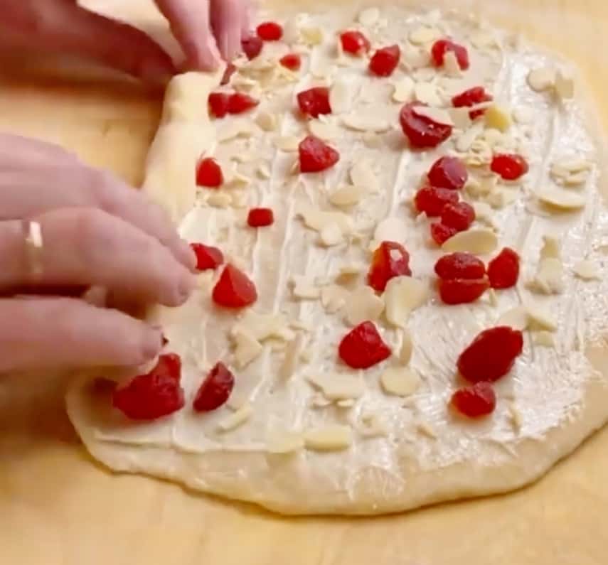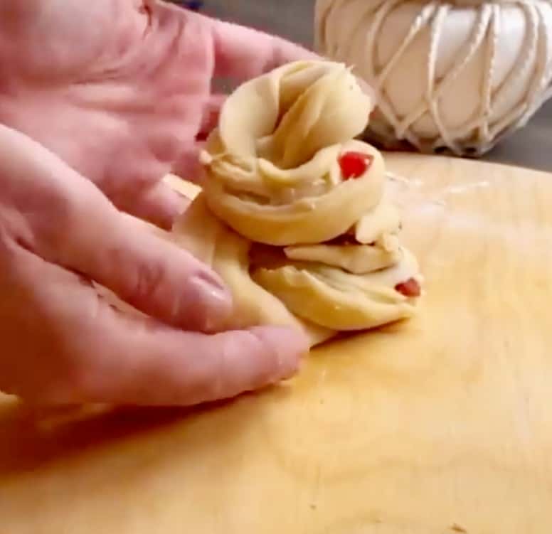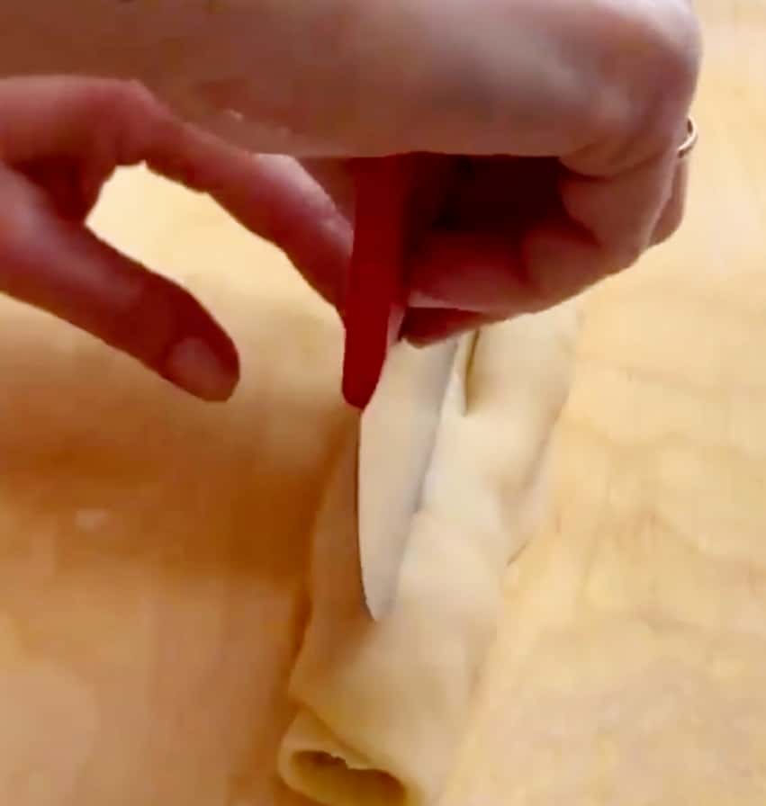 - Звертаємо в рулет і розрізаємо на дві частини вздовж, але не до кінця.