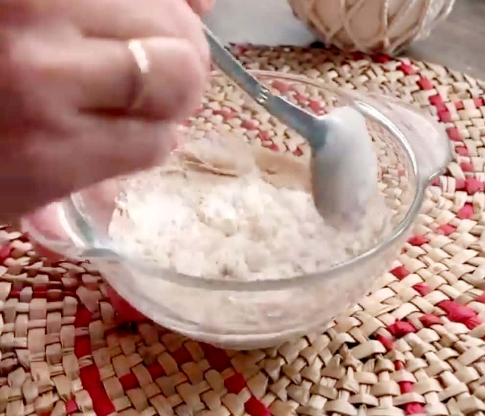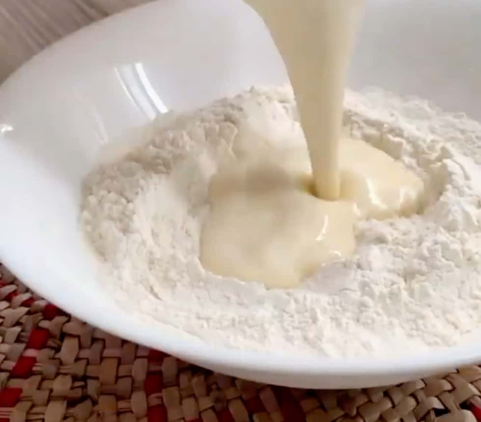 - Ставимо опару. Тепле молоко, дріжджі, цукор та борошно з’єднуємо, перемішуємо та залишаємо у теплому місці на 15 хвилин.