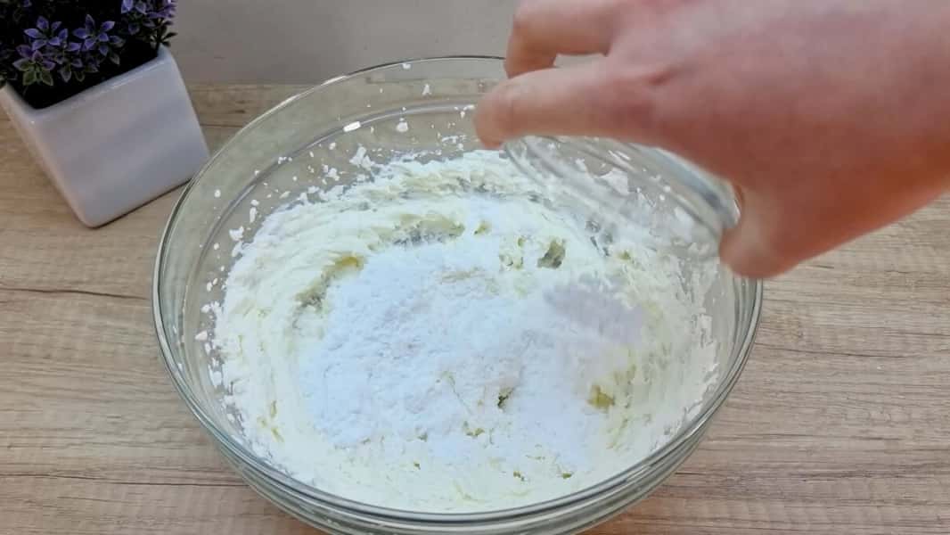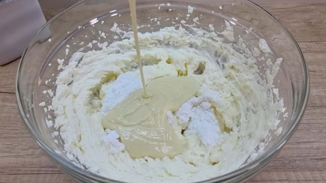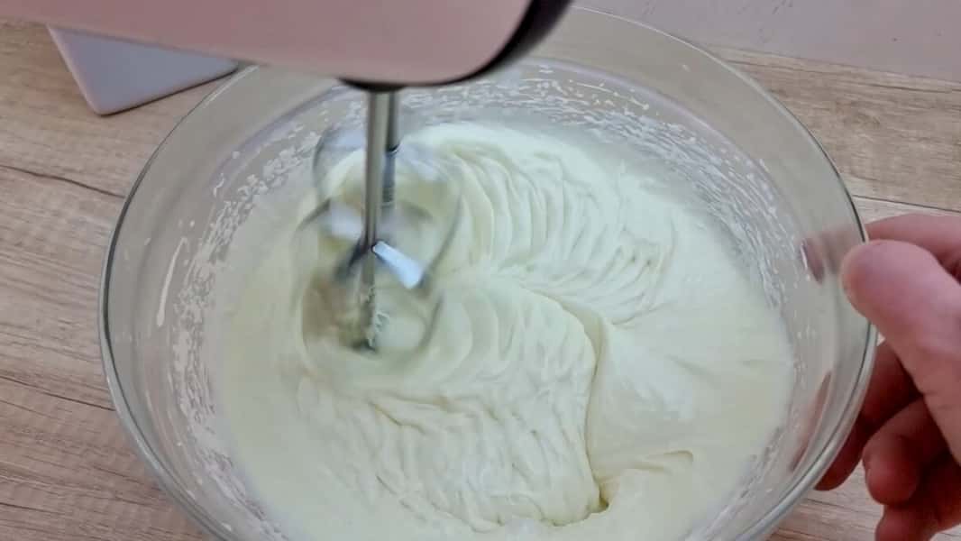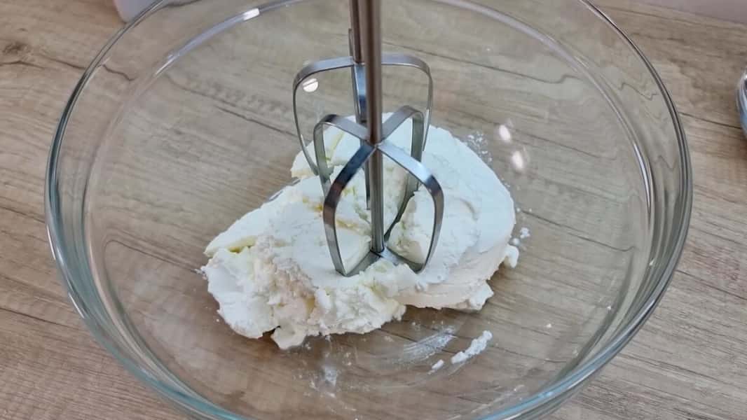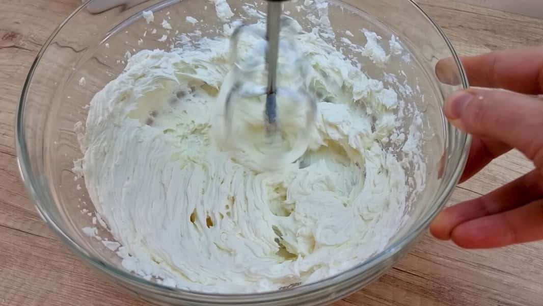 Приготувати крем: у ємності добре збити міксером маскарпоне чи вершковий сир.