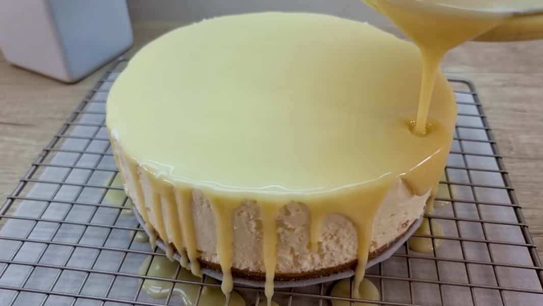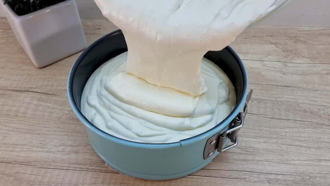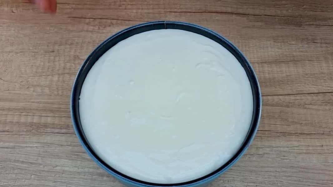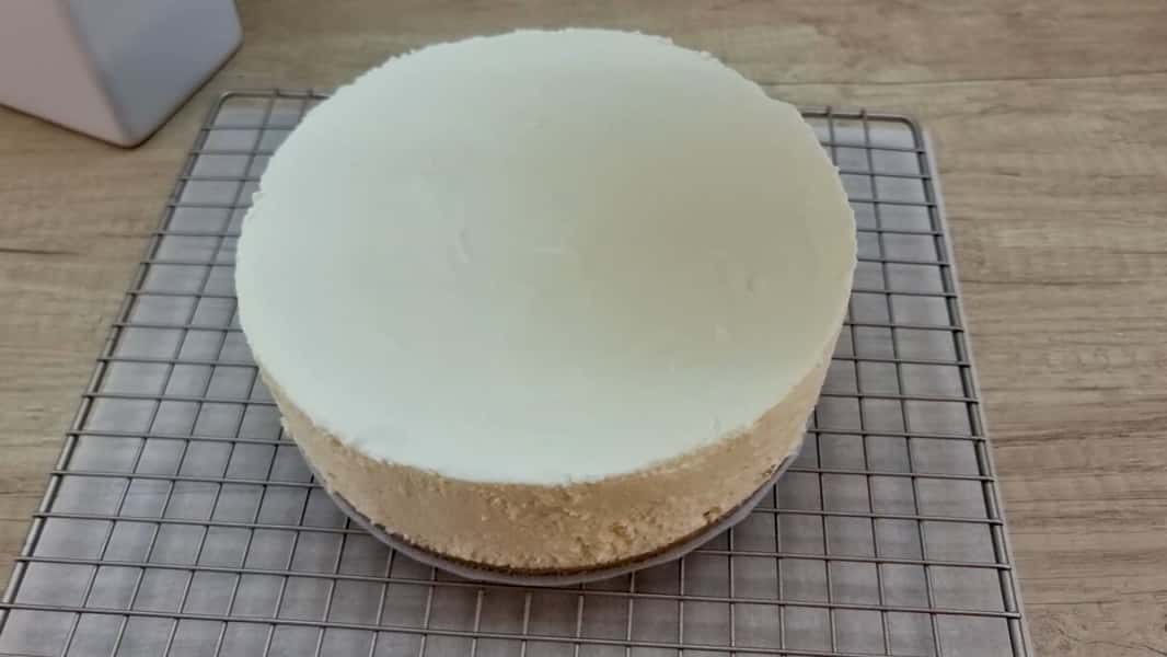 Вилити цю масу у форму на застиглий корж, добре розрівняти і поставити в холодильник щонайменше на 3 години, щоб добре застиг крем.