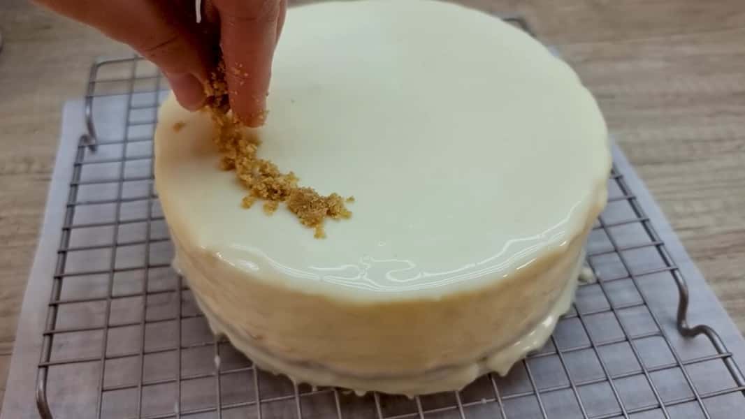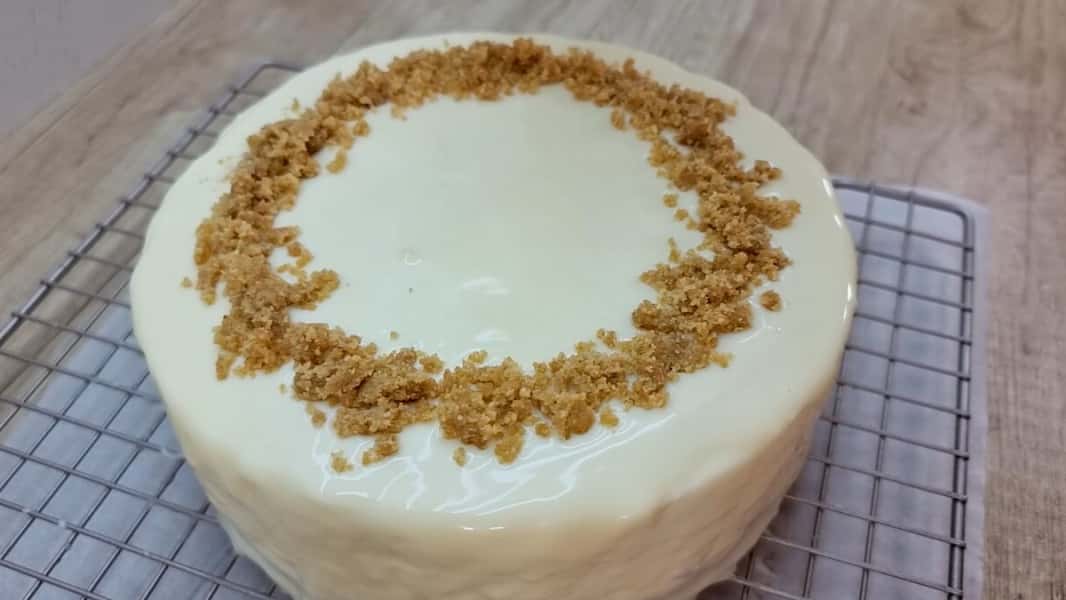 Дістати з форми застиглий торт, облити його шоколадною глазур’ю. Прикрасити крихтою, що залишилася, і поставити в холодильник мінімум на 30 хвилин для застигання глазурі