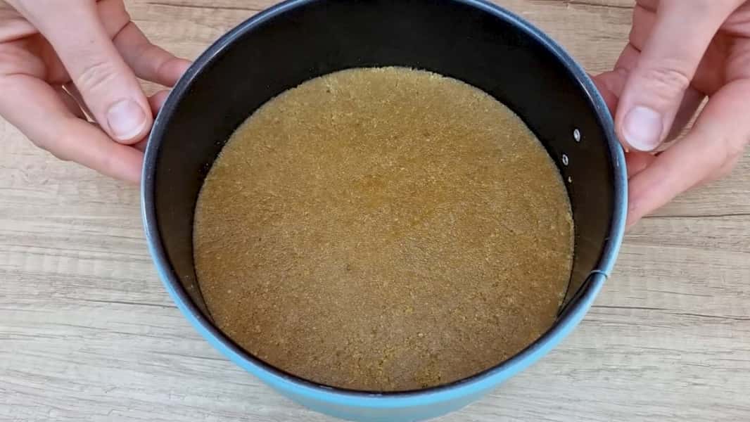 У форму діаметром 18 см викласти отриману масляну крихту та добре ущільнити ложкою. Поставити в холодильник на деякий час для стабілізації коржа. Трохи крихти залишити для прикраси