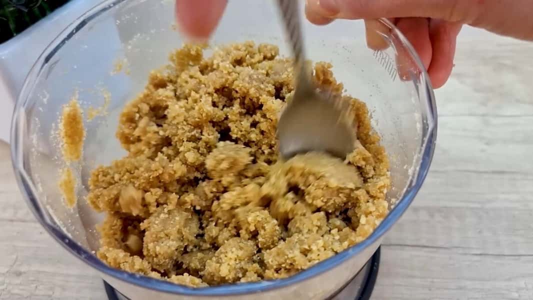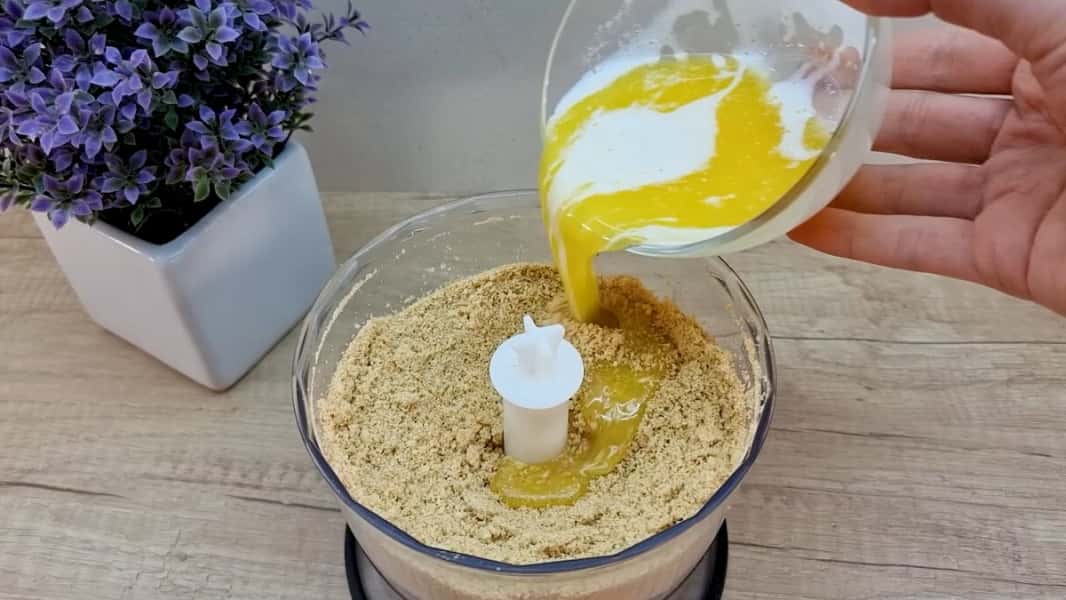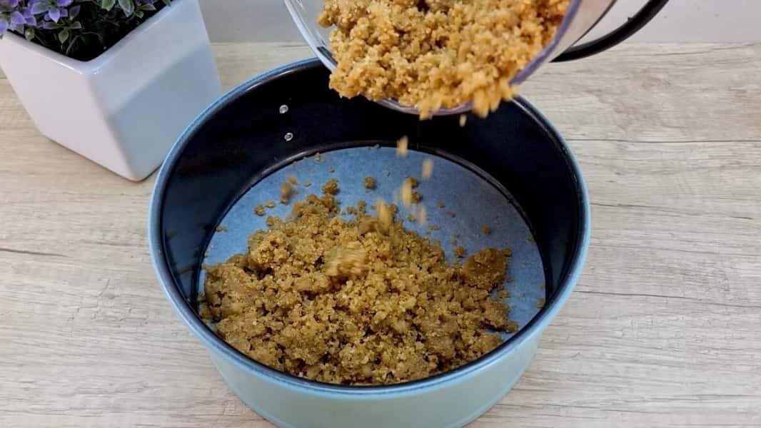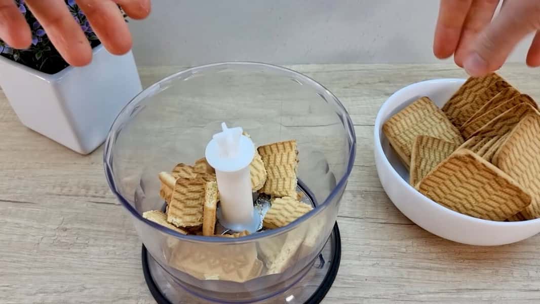 У блендері подрібнити в крихту печиво (типу до чаю, кави, цукрове). Розтопити вершкове масло і влити в блендер до подрібненого печива. Все добре розмішатиме до однорідності