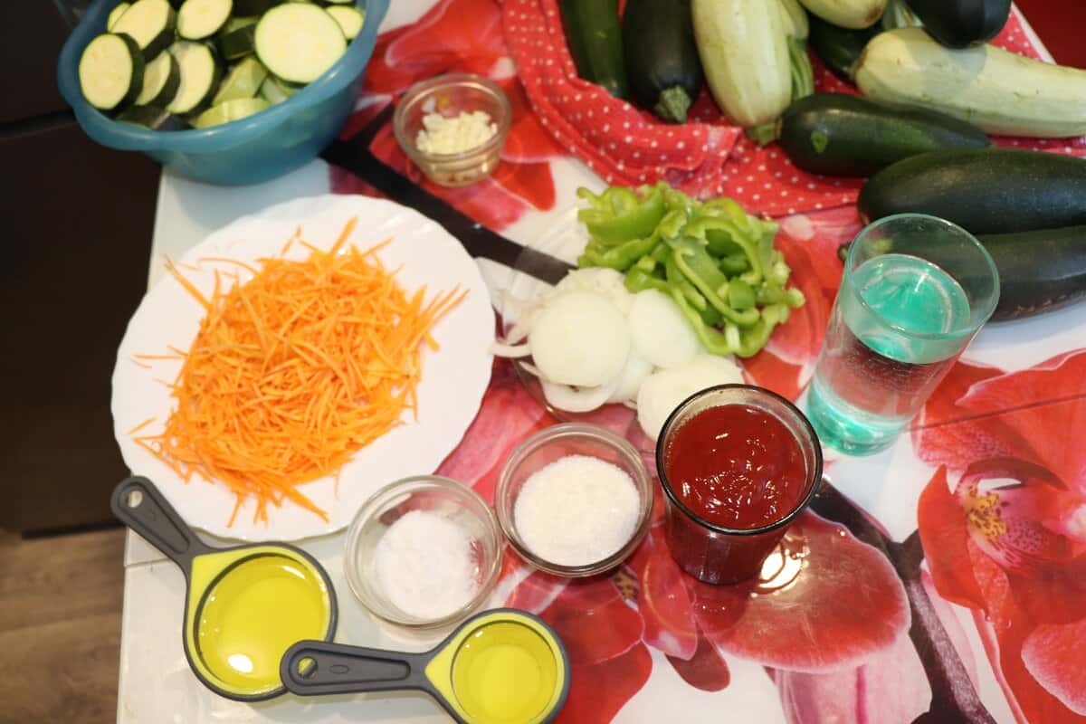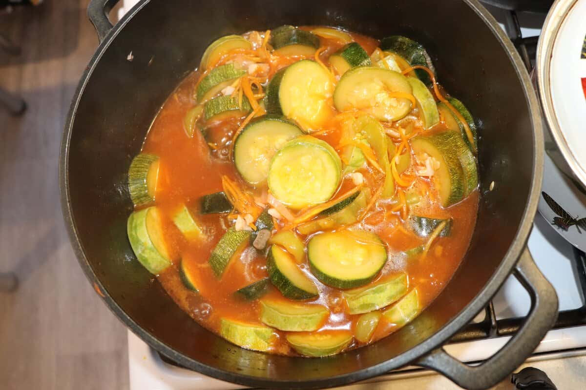 3. Викласти кабачки в глибоку каструлю. Надіслати туди ж моркву, нашатковану соломкою.
