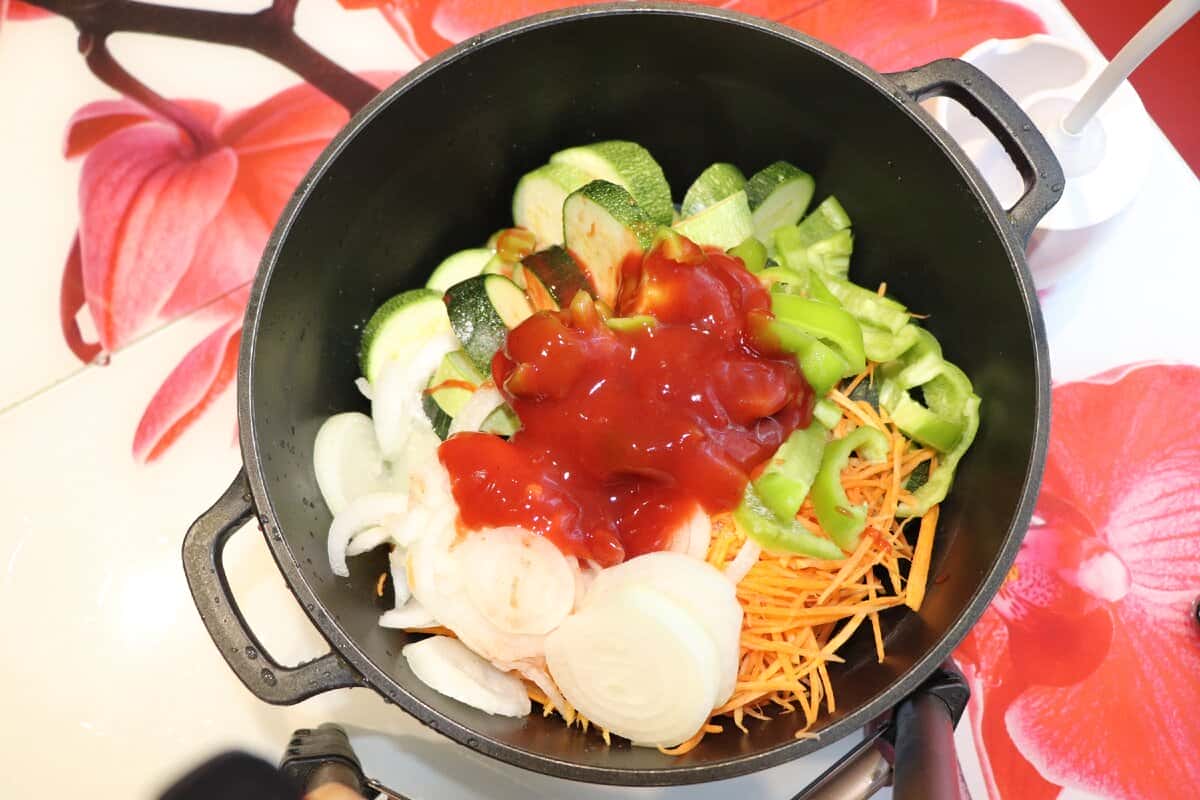 4. Перець нашаткувати великою соломкою, перекласти до кабачків, додати туди ж кільця цибулі. Пересипати сіль, цукор. Влити в каструлю олію, воду, кетчуп. Перемішати все. Поставити каструлю на плиту. Варимо 15 хвилин.
