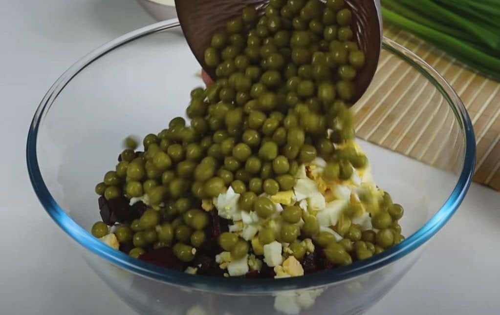 З’єднуємо інгредієнти: курка, буряк, зелений горошок, відварні яйця.