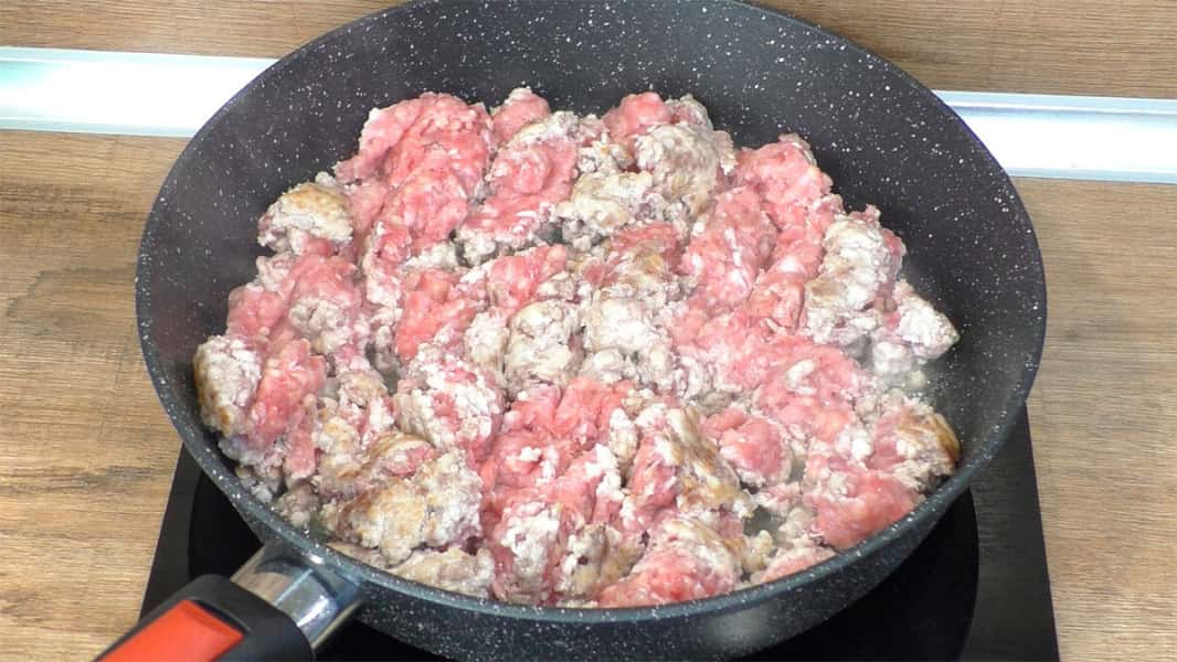 Приготуємо м’ясну начинку. Беремо будь-який фарш із курки, індички, свинини чи яловичини. У мене змішаний. Обсмажуємо на олії, помішуючи на середньому вогні близько 5 хвилин. У фарш я заздалегідь додала подрібнену цибулю та часник.