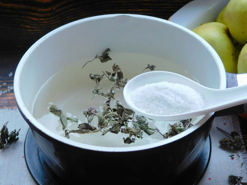 2. Спочатку зробити маринад. У воду всипати суху м’яту, сіль і цукор. Дати закипіти, а потім залишити під кришкою остигати до кімнатної температури.
