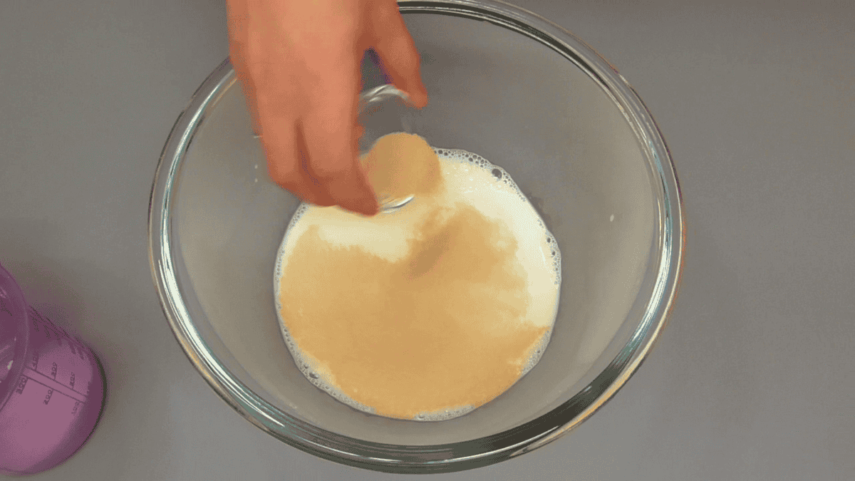 ✅ В тепле молоко додаємо трохи цукру ( від загальної кількості ), перемішуємо. Додаємо дріжджі перемішуємо, щоб вони добре розійшлися. Ми залишаємо масу постояти хвилин 15.