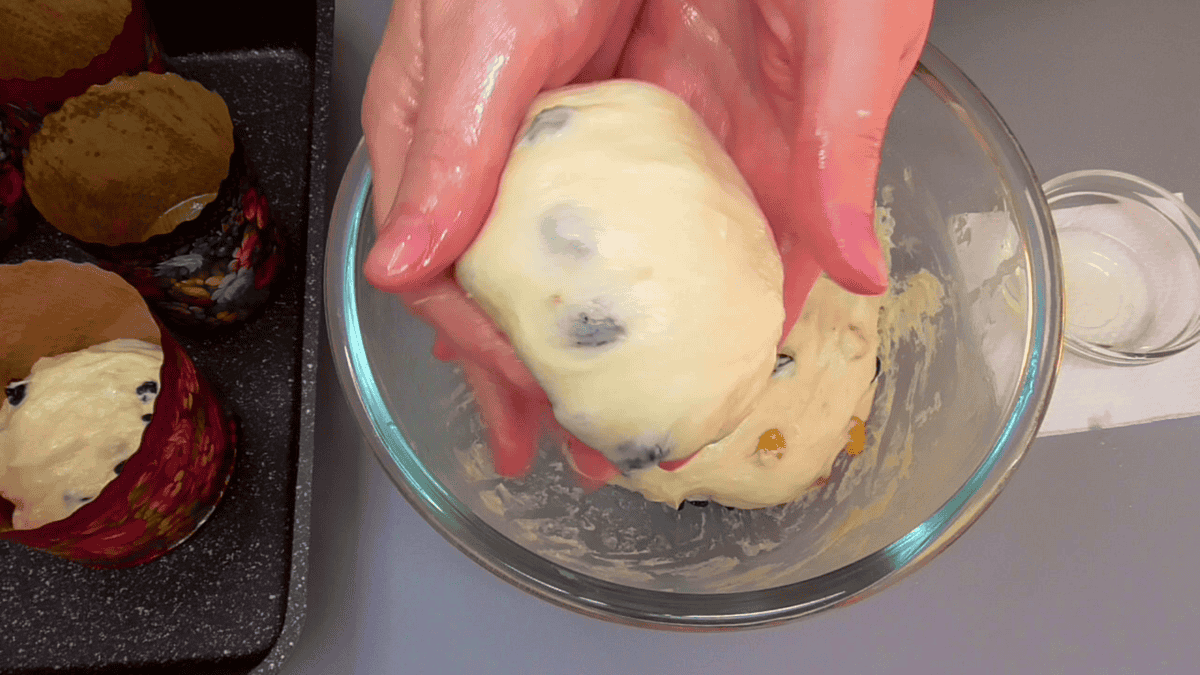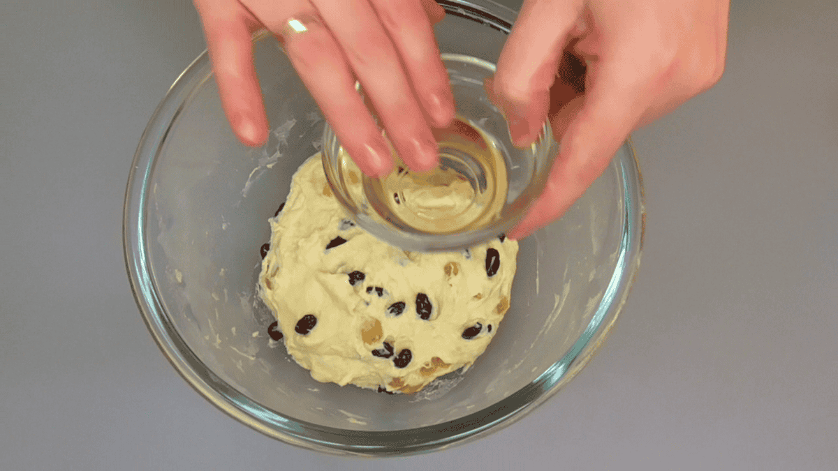✅ Додаємо родзинки ( можна робити без родзинок ). Руки змащуємо олією і починаємо вимішувати тісто руками. Навіть якщо тісто буде здаватися занадто м’яким не потрібно додавати в нього більше борошна, інакше воно не буде настільки м’яким і повітряним. Поступово тісто стане більш еластичним.