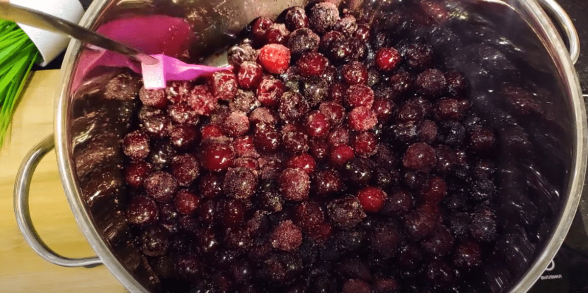 3. Далі обертаємо каструлю круговими рухами, все перемішуємо. Вишня соковита та сік дуже швидко виділяється.