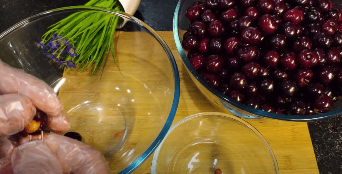 1. Вишню заливаємо на пів години солоною водою, 1 ст. ложку солі на літр води, усі черв’ячки вилазять. Потім промиваємо її під проточною водою. Видаляю кісточки за допомогою звичайної шпильки, вона менше травмує ягоди. Якщо ви працюєте без рукавичок, протріть руки шматочком лимона і руки стануть чистими. Вага вишні без кісточок 3 кілограми.