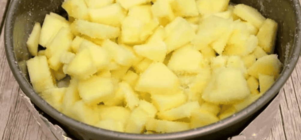 Форму 18 см обертаємо фольгою та змащуємо вершковим маслом. Кладемо яблука, посипаємо цукром і перемішуємо.