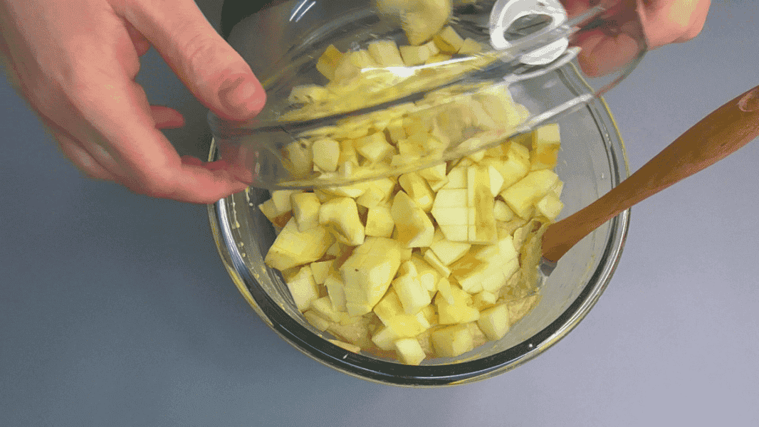 ✅Додаємо яблука в тісто, перемішуємо.