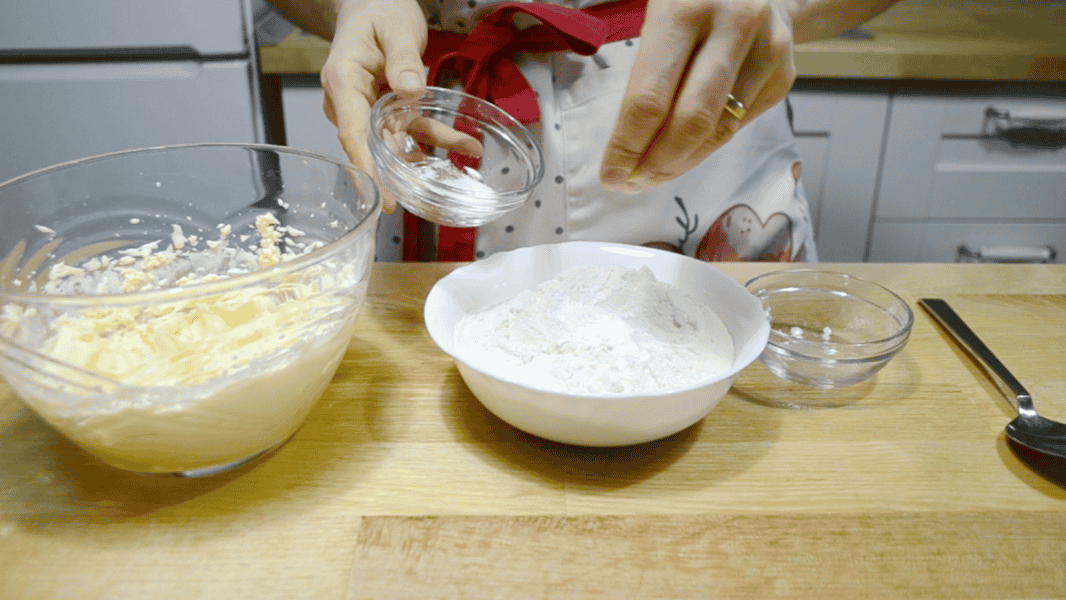 Просіяне борошно змішую з розпушувачем і щіпкою солі.