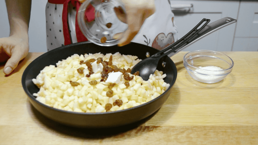 До яблука додаю вершкове масло, родзинки (за бажанням) та цукор.