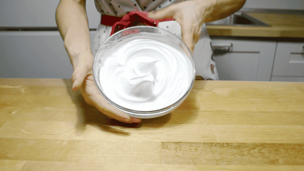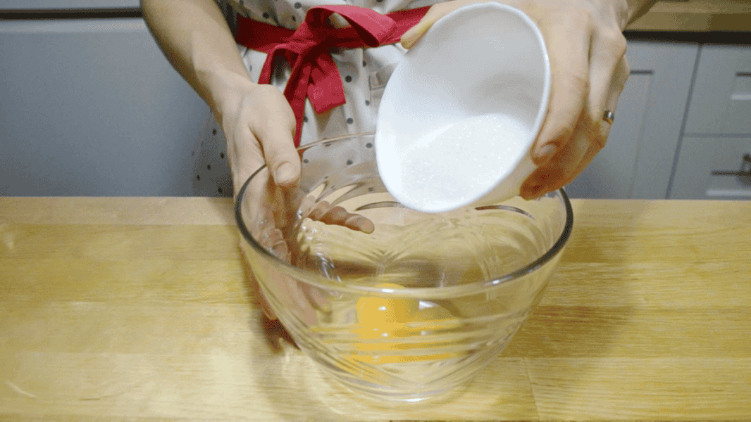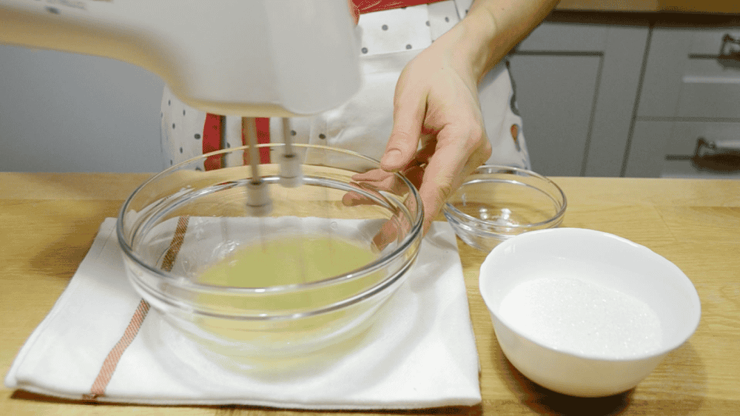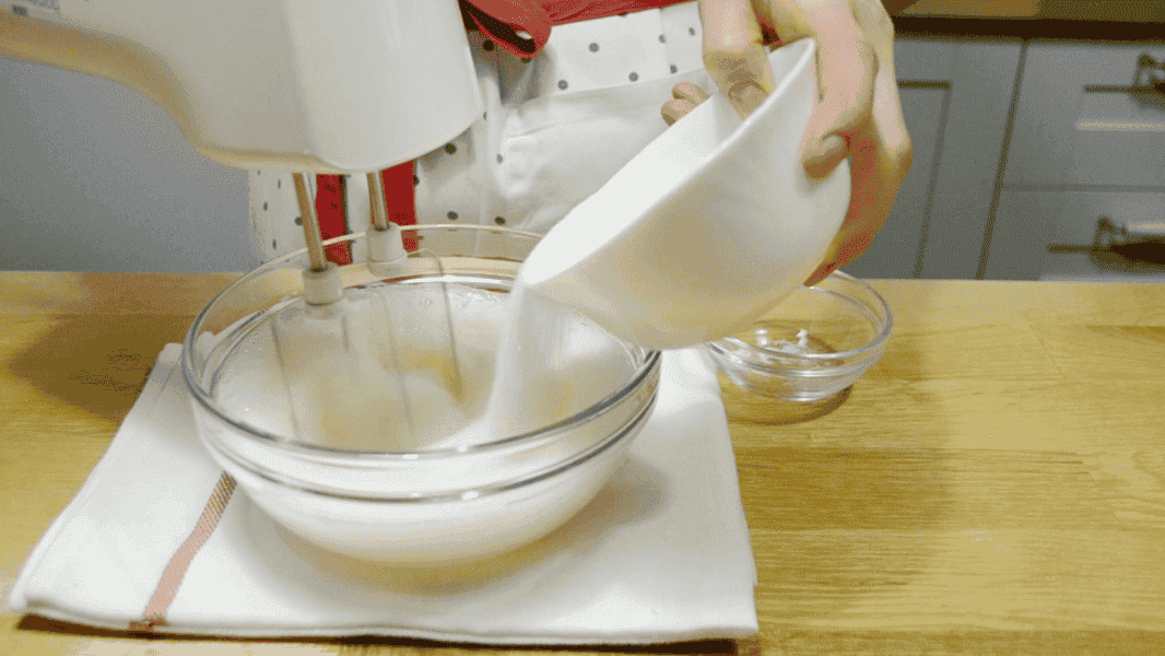 Потроху всипаю цукор, збільшую швидкість міксера та збиваю до стійких піків.