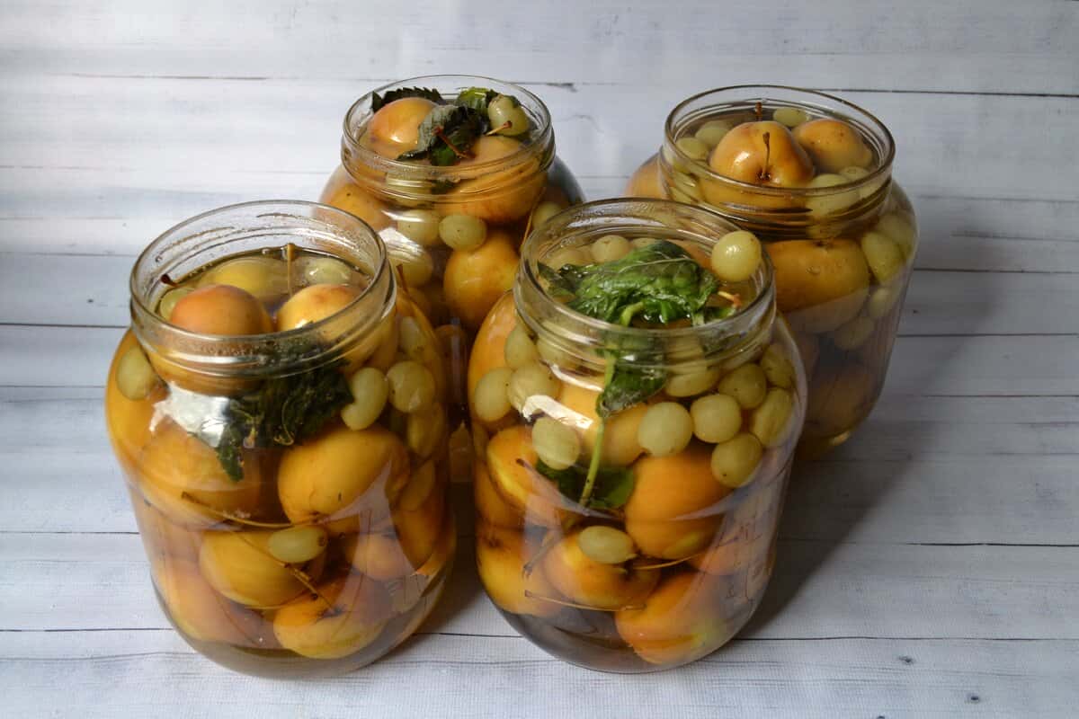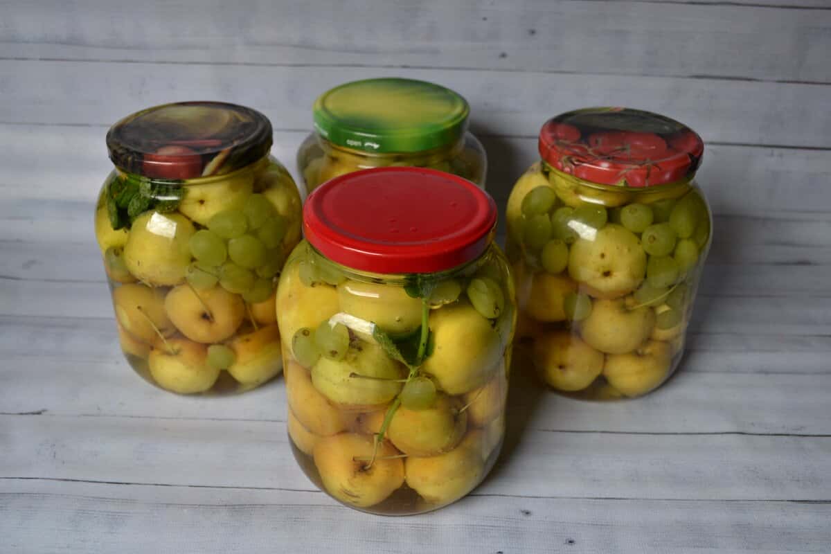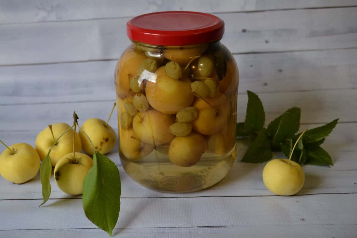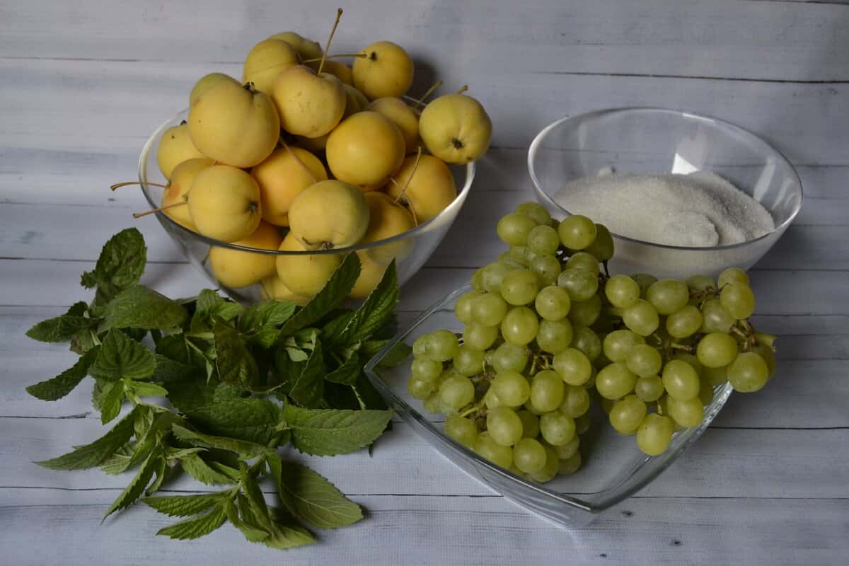 Для приготування візьміть маленькі, розміром з волоський горіх, яблучка і світлий виноград. Фрукти повинні бути міцні, цілі, без пошкоджень. Для аромату можете використовувати гілочки м’яти або мелісси.