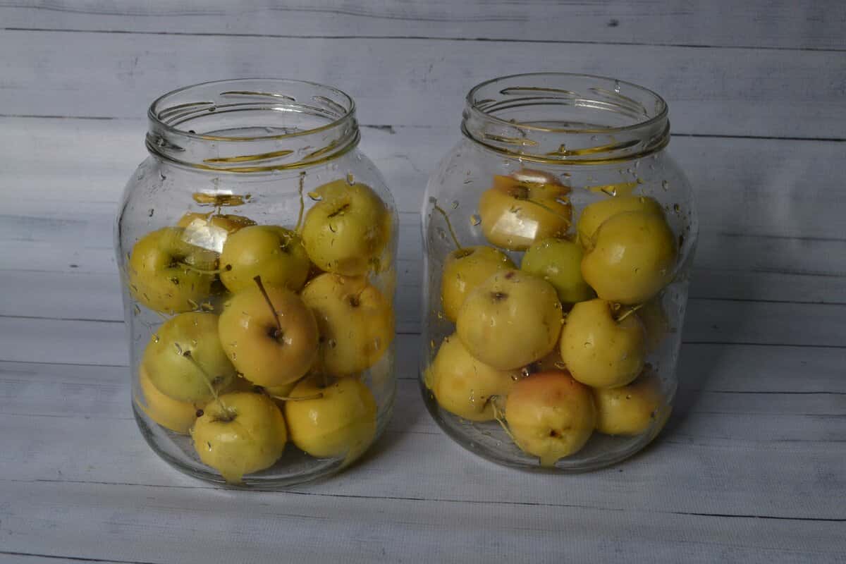 Яблука промийте, хвостики можете не видаляти, з ними вийде симпатичніше. Заповніть банки вимитими яблуками на 2/3 обсягу.