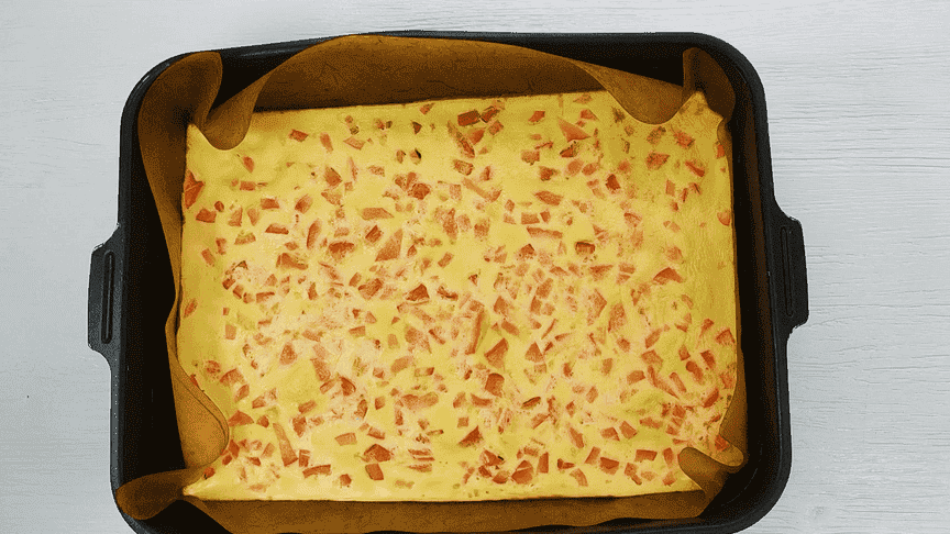 4. Форму для випікання застеліть антипригарним килимком або хорошим пергаментним папером. Виливаємо яєчну суміш. Випікаємо у духовці при 180 ° С близько 20 хвилин.