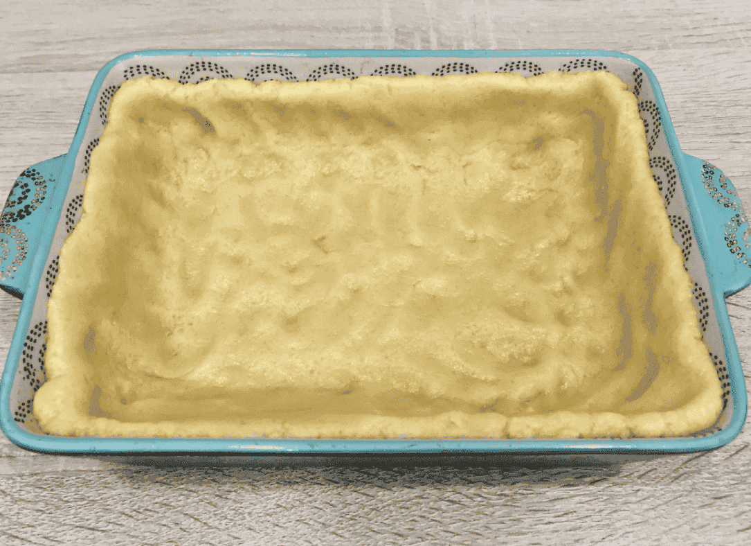 Беремо форму (розмір моєї – 23*17), розминаємо в ній тісто по дну та краях. І хвилин 20 потримаємо у холодильнику.