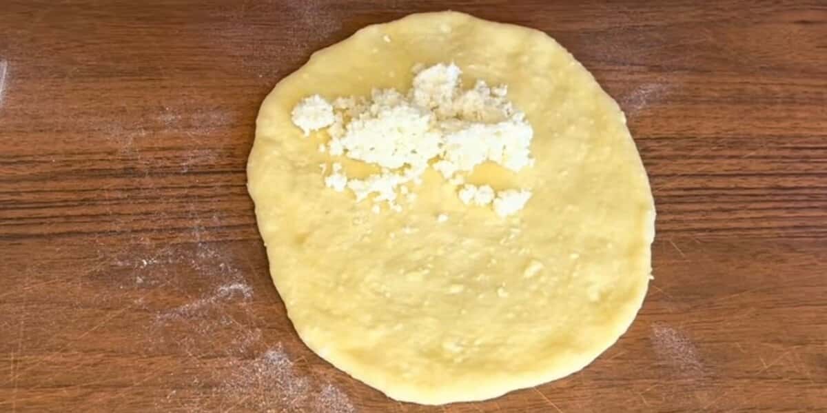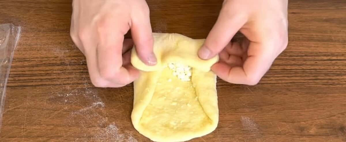 За цей час готуємо начинку ( у мене сир, перемішаний з цукром). Розтягуємо кульки пальцями і викладаємо начинку.
