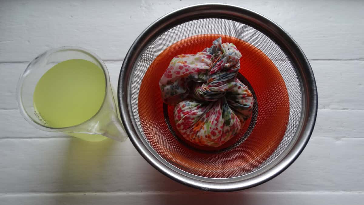 3 ) Коли кефір повністю розтане, віджимаємо з нього рідину, скручуючи тканину. Сироватку зливаємо. Вона нам ще знадобиться, але для якої-небудь іншого страви.