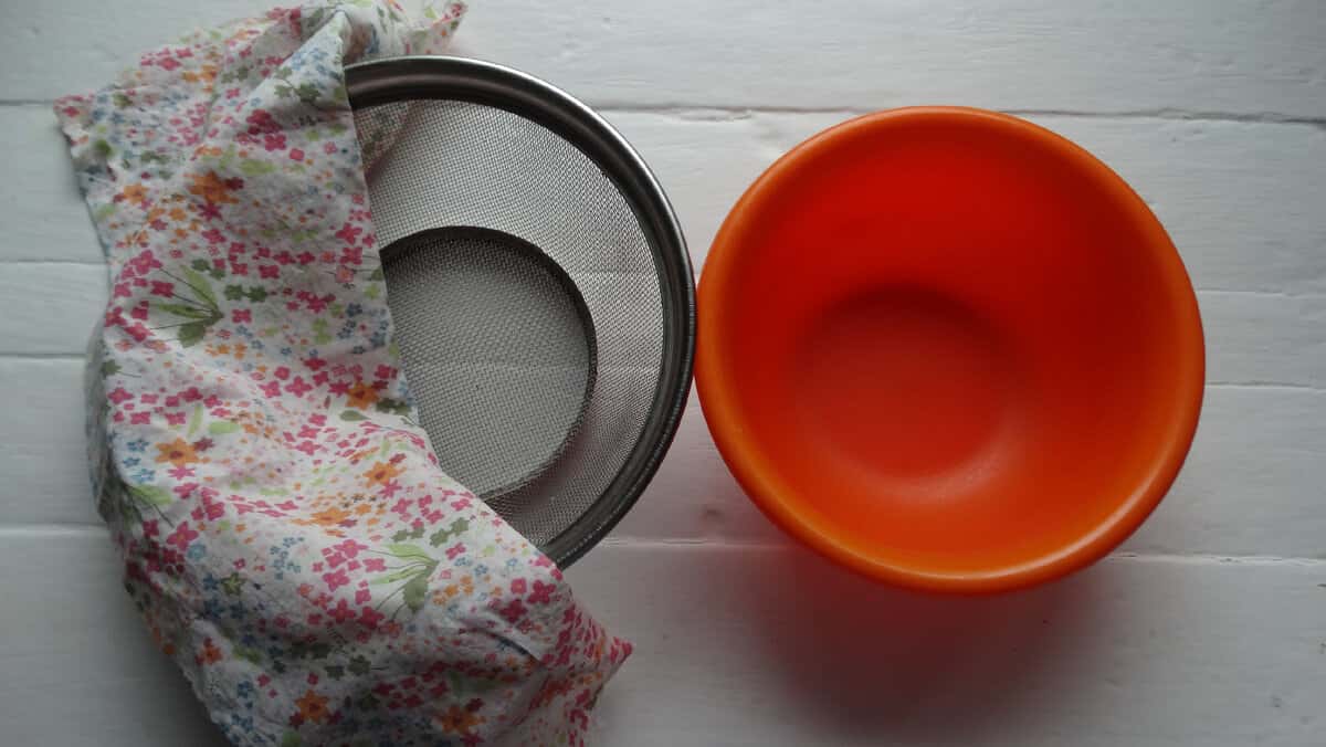 Крім кефіру нам ніякі продукти не потрібні, тільки інструменти: миска, дрібне сито, тонка тканина або марля.