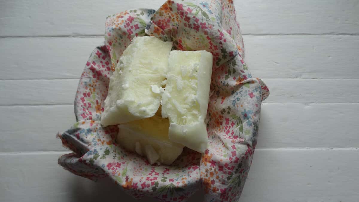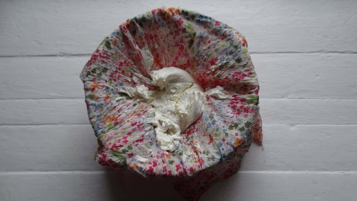 4 ) Розкриваємо тканинний мішечок. Тільки подивіться, який щільний виходить сир.