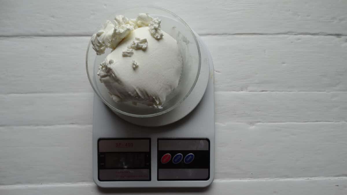 5 ) Для перевірки експерименту я зважую сир. Отже, з 900 мл у мене вийшло 275 гр сиру + сироватка.