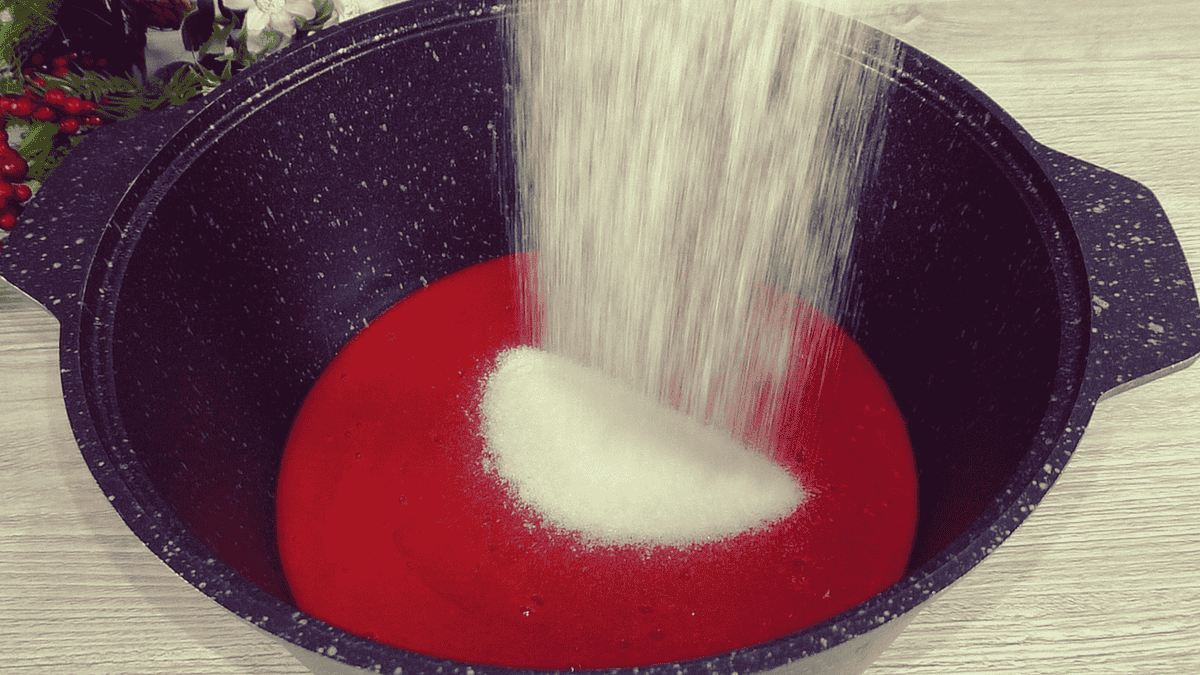 Додати цукор, поставити каструлю з ягідною масою на вогонь, постійно помішуючи довести до кипіння, води додавати не потрібно.
