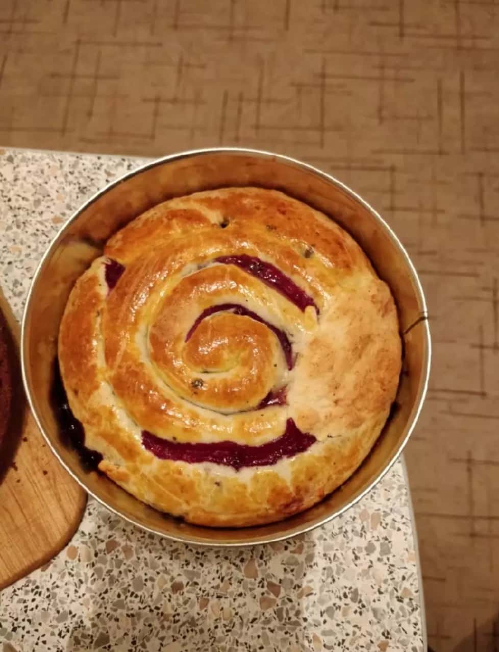 - Поділити тісто на 4 однакові шматочки. Кожен шматочок тіста розкачати прямокутний пласт, рівномірно розподілити макову начинку. По одному краю викласти вишні (трохи віджаті від соку). Згорнути рулети, добре защипнути.