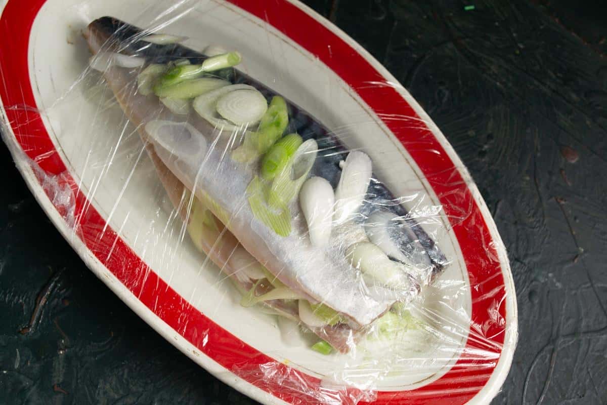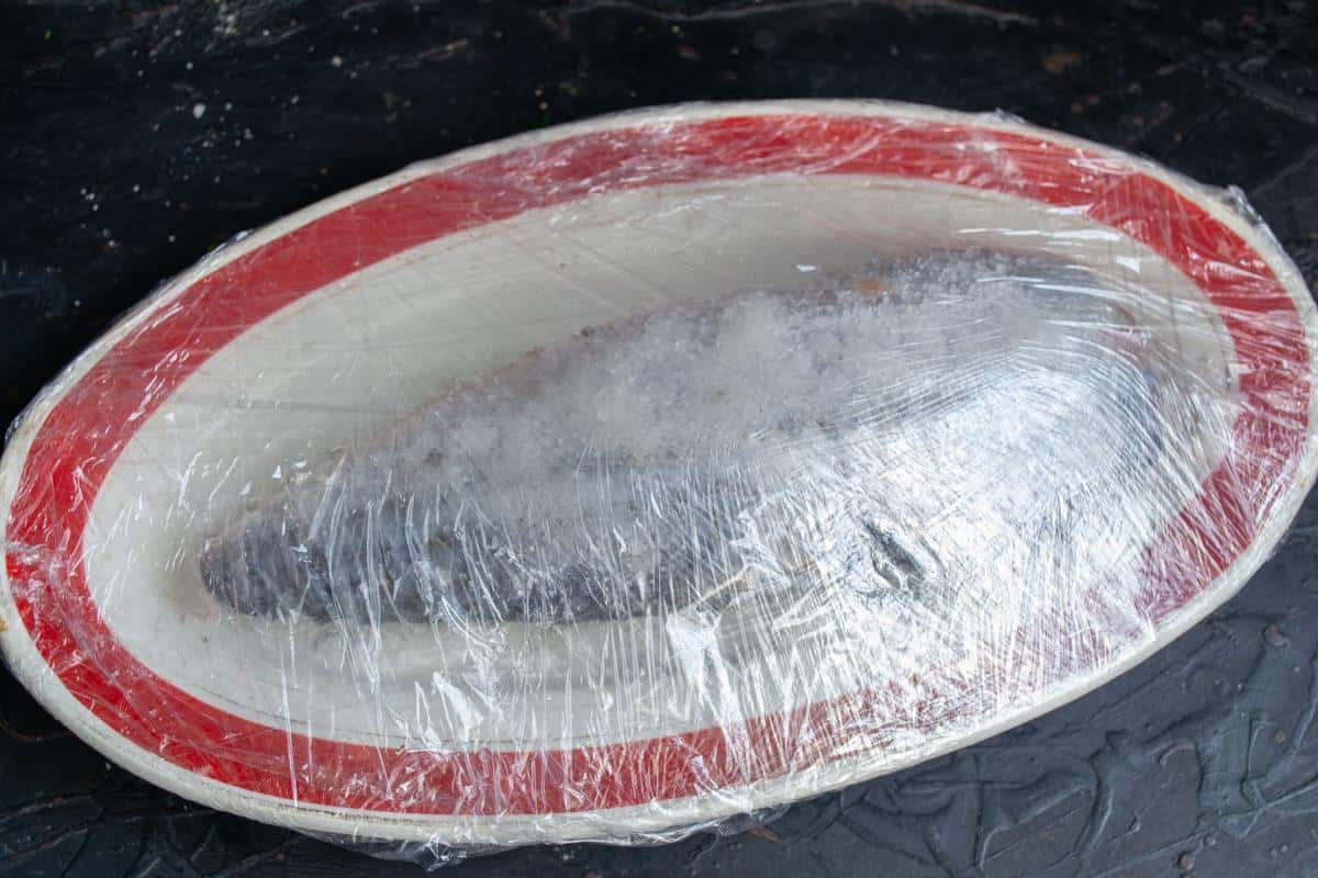 Щільно обертаємо тарілку з рибою декількома шарами харчовою плівкою. 2-3 години залишаємо при кімнатній температурі, після прибираємо в холодильник. За 24 години засолиться, буде слабосолоною.