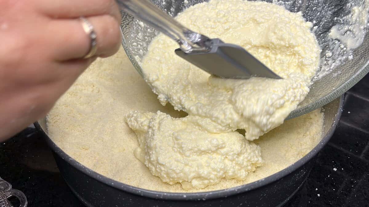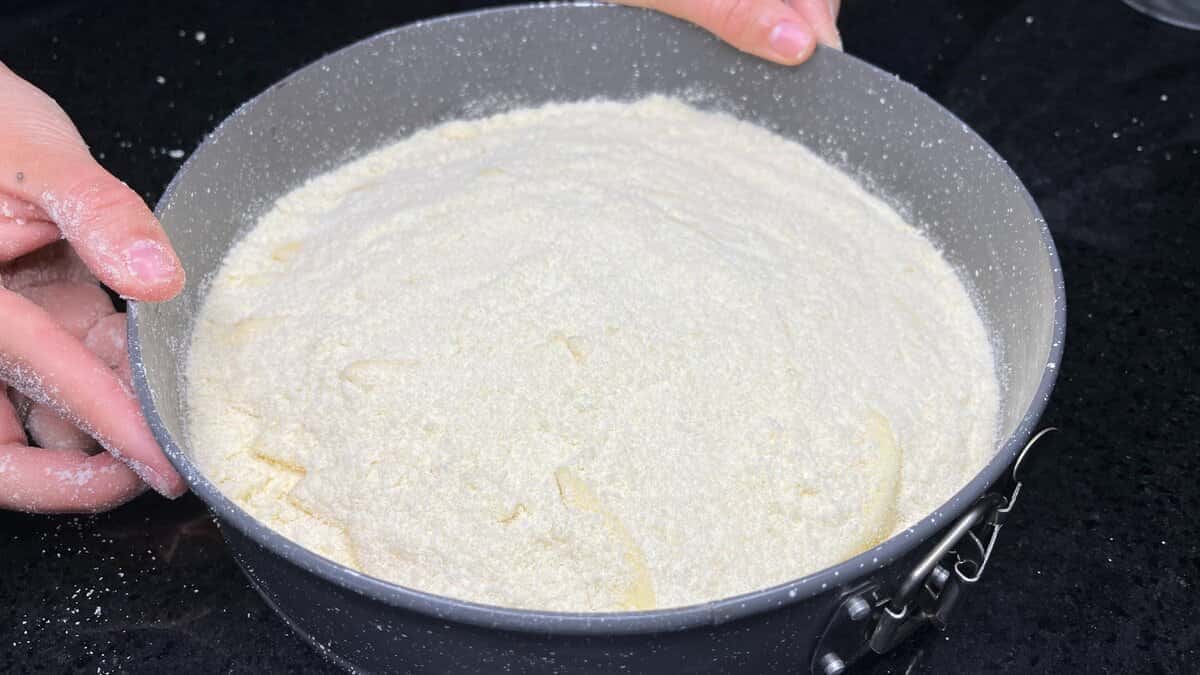 Одержану масу ділимо на 2 частини ( одна повинна бути більше, інша – менше ). Більшу частину викладаємо рівним шаром в форму для випікання.