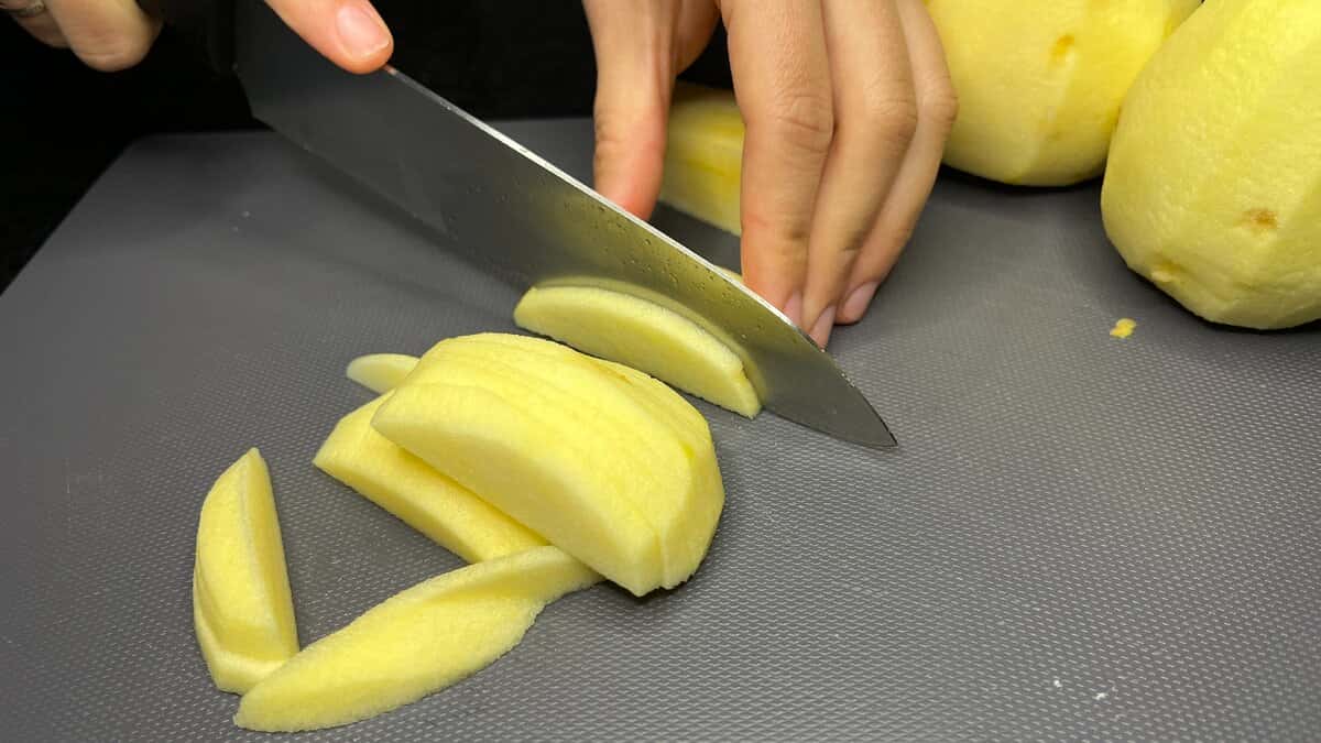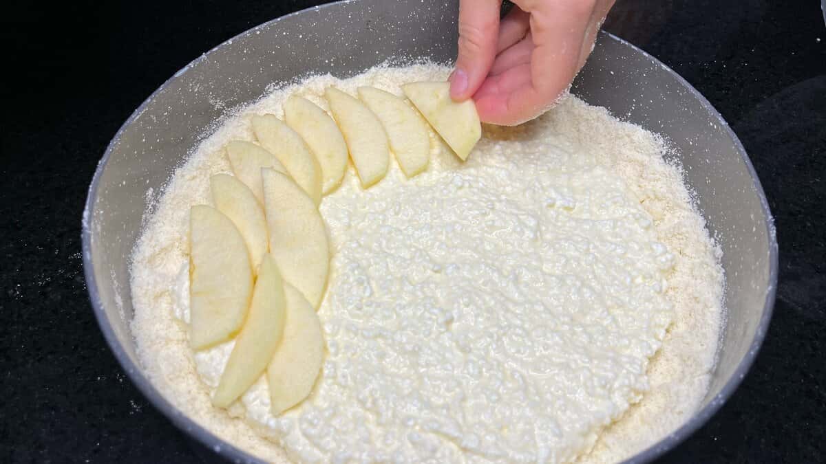 3 середніх яблука очищаємо від шкірки і ріжемо тонкими часточками. Їх викладаємо поверх сирної начинки.