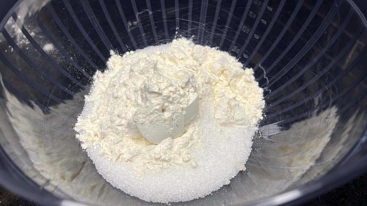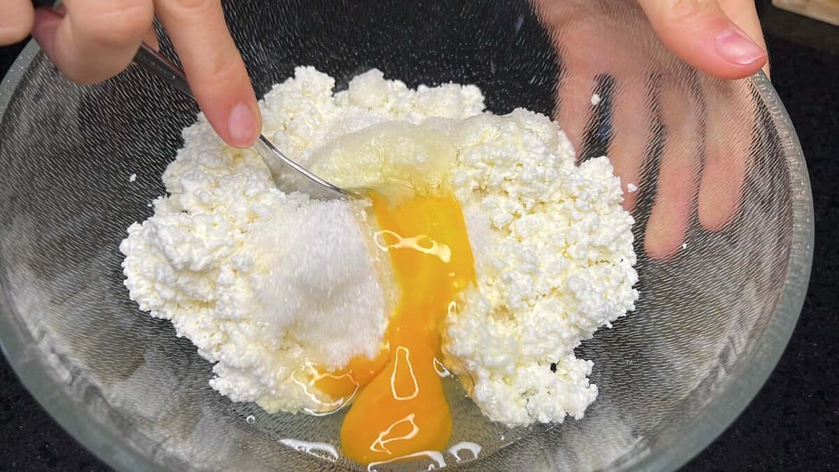 У миску кладемо 700 гр. сиру. Додаємо 3 ст. л. цукру, 1 сире яйце і все перемішуємо.