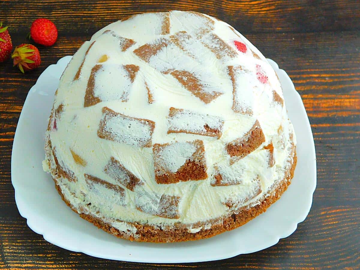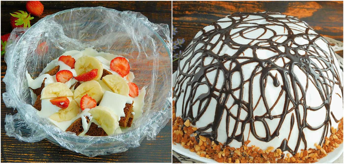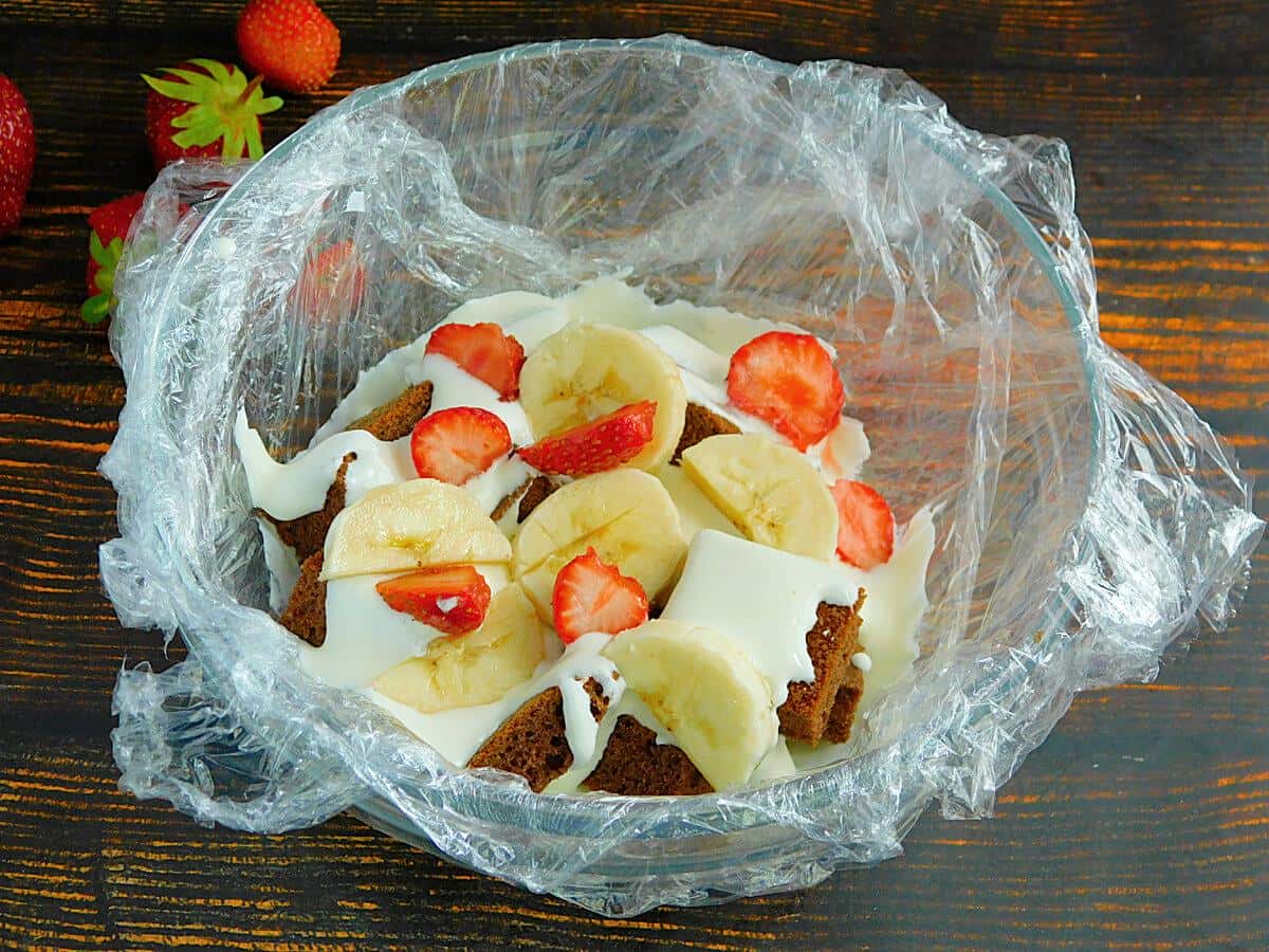 Куполоподібну миску вистелити харчовою плівкою, змастити зсередини кремом і шарами викласти бісквіти, шматочки полуниці і банана, щедро промащуючи кремом. До речі, банан можна замінити на ананас, вийде теж дуже смачно.