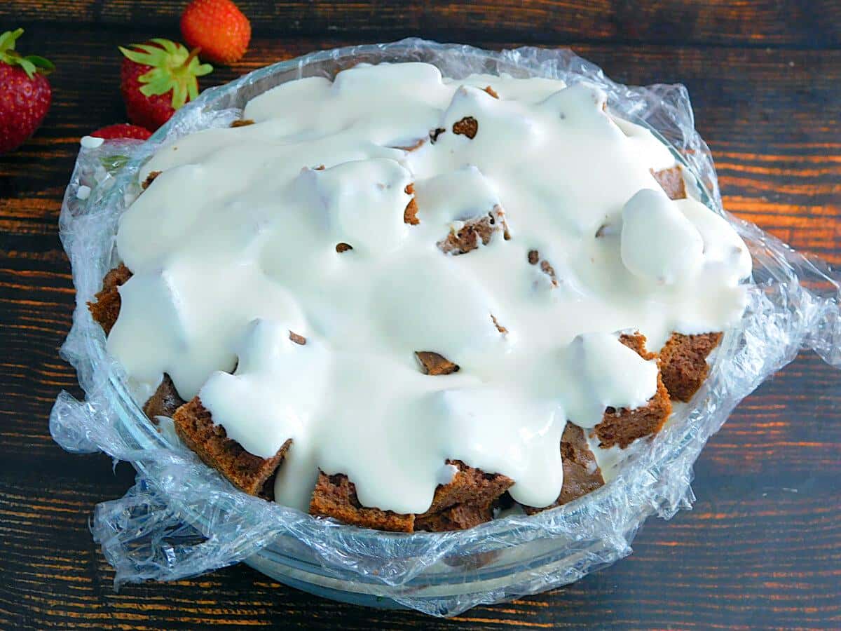 Наверх помістити круглий корж і добре його притиснути, щоб заповнити всі порожнечі. Затягнути плівкою і прибрати на ніч в холодильник для просочення.