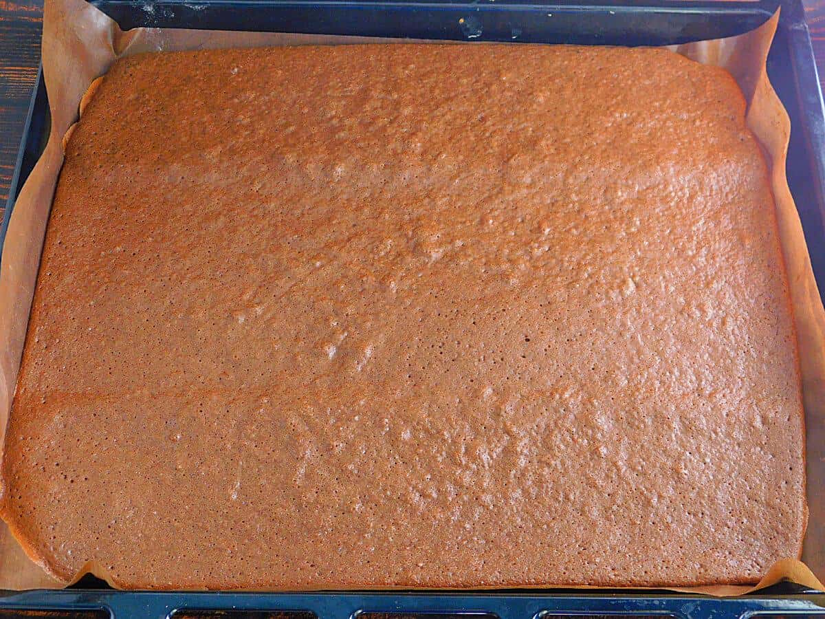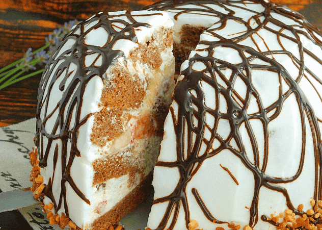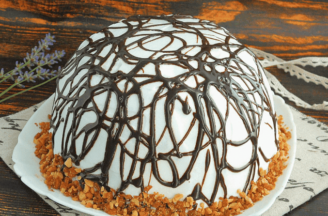 Прикрасити за бажанням. Можна вирівняти збитими вершками і нанести смужки з розтопленого шоколаду, а низ посипати подрібненими горіхами.