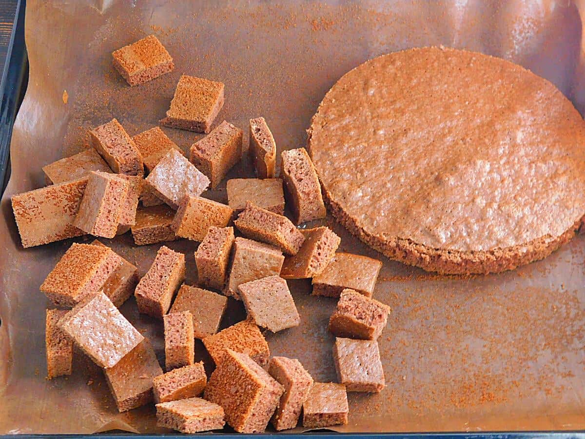 Вирізати коло по діаметру миски, в якій будете збирати торт, решту коржа нарізати на квадрати.