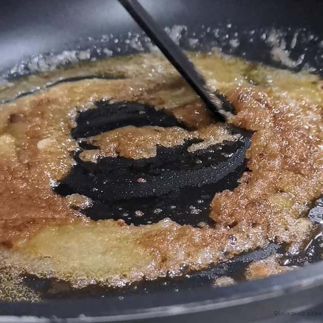 Помішуємо лопаточкою і тримаємо на тому ж вогні поки цукор майже повністю не розтопиться. Це приблизно близько хвилини.