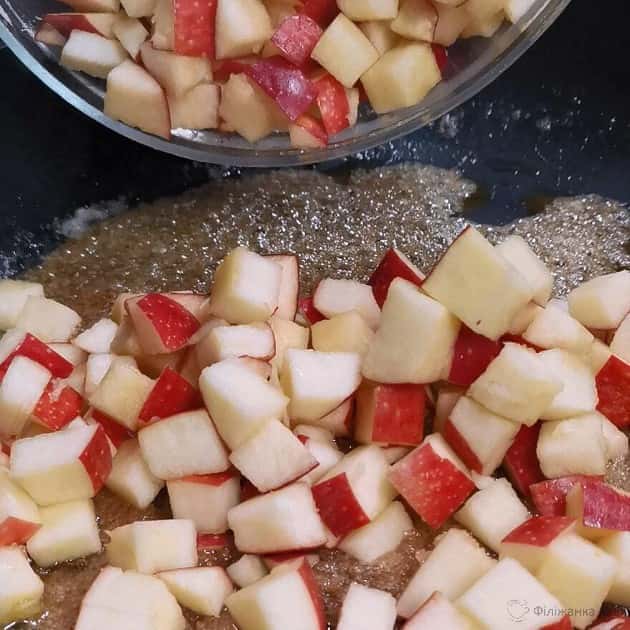 Смажимо до карамелізації. Аромат буде приголомшливий. За часом це приблизно 5 – 6 хвилин. Але тільки саме смажимо, а не тушкуємо. Рідина повинна майже вся випаруватися, а яблука потемніють. Можна навіть, щоб шкурка подекуди дуже сильно зарум’янилася як корочка. Так ще смачніше.