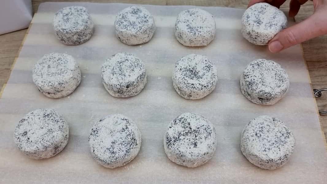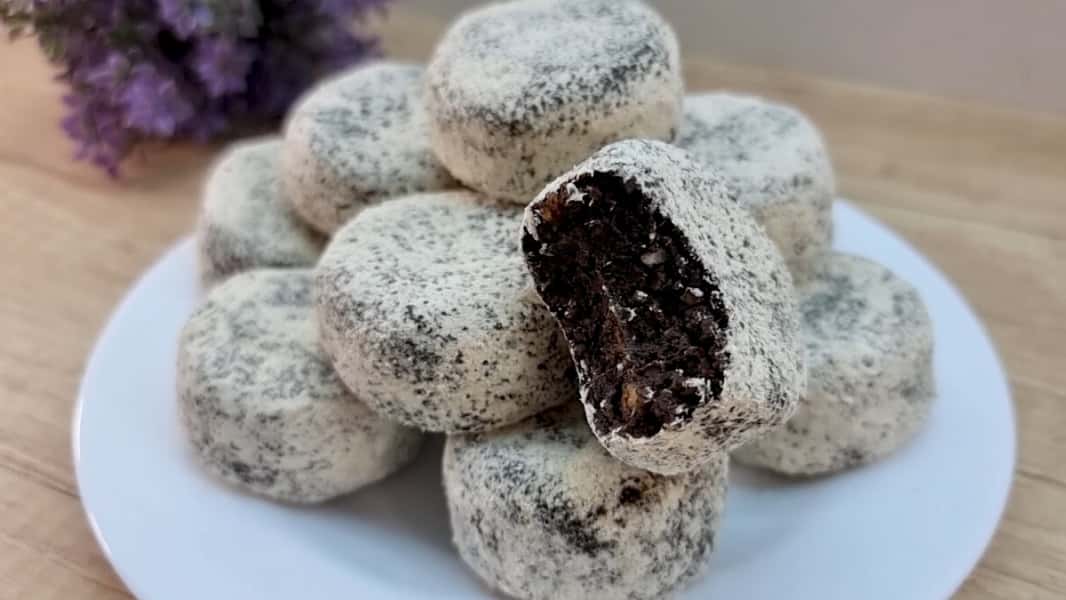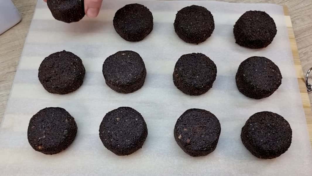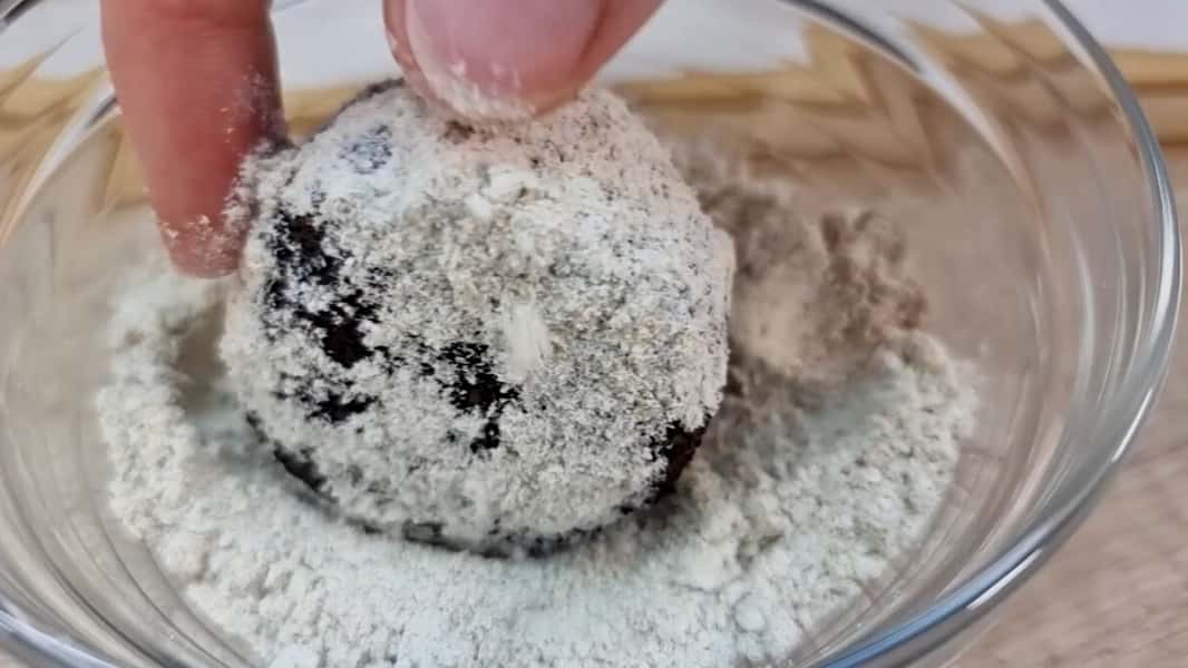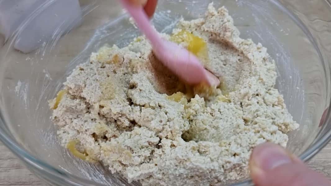 З цієї маси сформувати зручним способом печиво, величиною приблизно з волоський горіх і трохи приплескати. Обваляти в вівсяному борошні (попередньо підсмаживши його на сухій сковороді до приємного запаху).