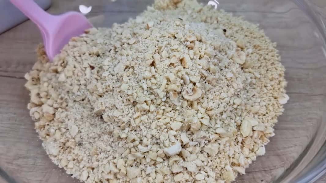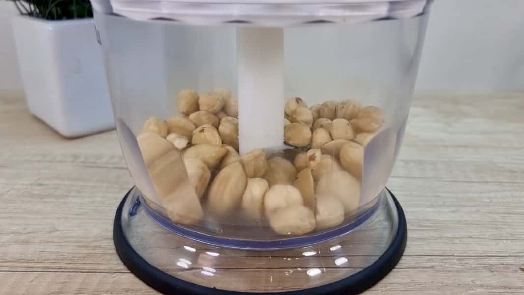 Фундук також подрібнити в блендері, але можна трохи більше ніж арахіс. Додати в ємність із арахісом і добре перемішати