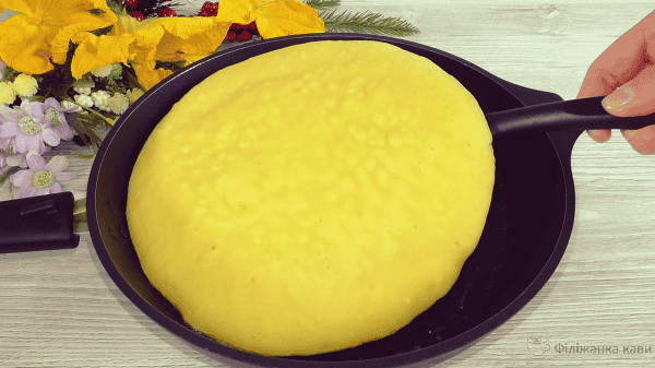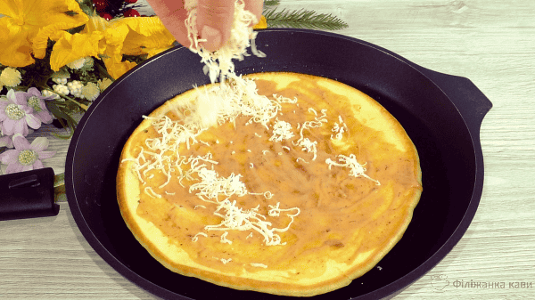 На змащену олією сковороду вилити тісто, трохи розрівняти. Готувати під кришкою, на середньому вогні, до зарум’янювання нижньої сторони. Орієнтовно 5-6 хвилин, дивіться по своїй сковороді і плиті.