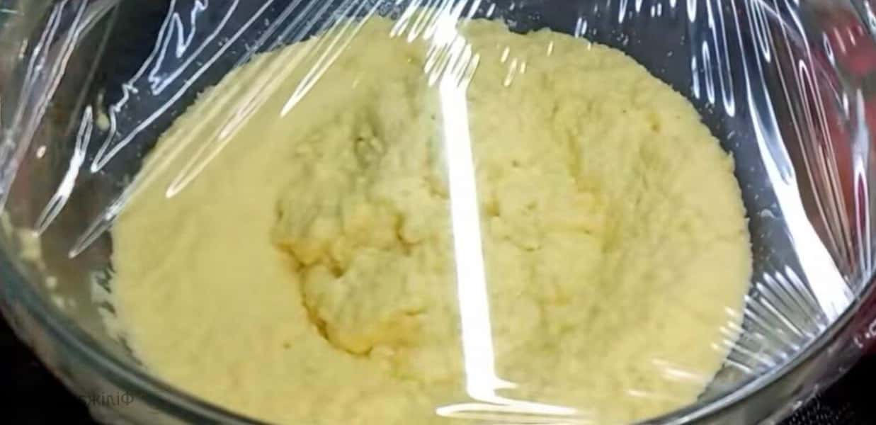 Посипаємо манною крупою і ретельно розмішуємо. Покриваємо харчовою плівкою і даємо постояти тридцять хвилин.