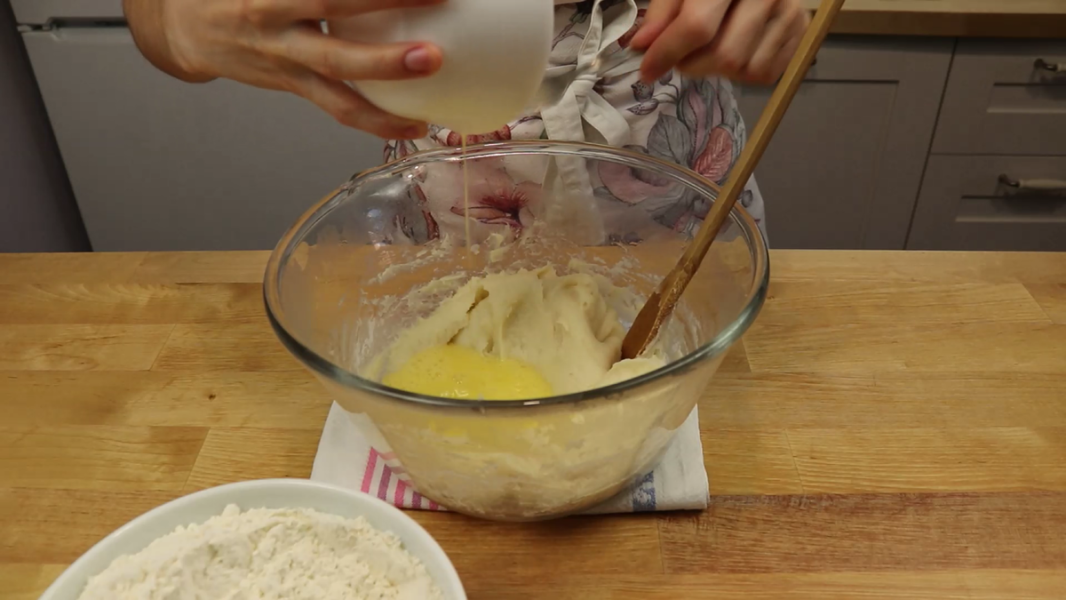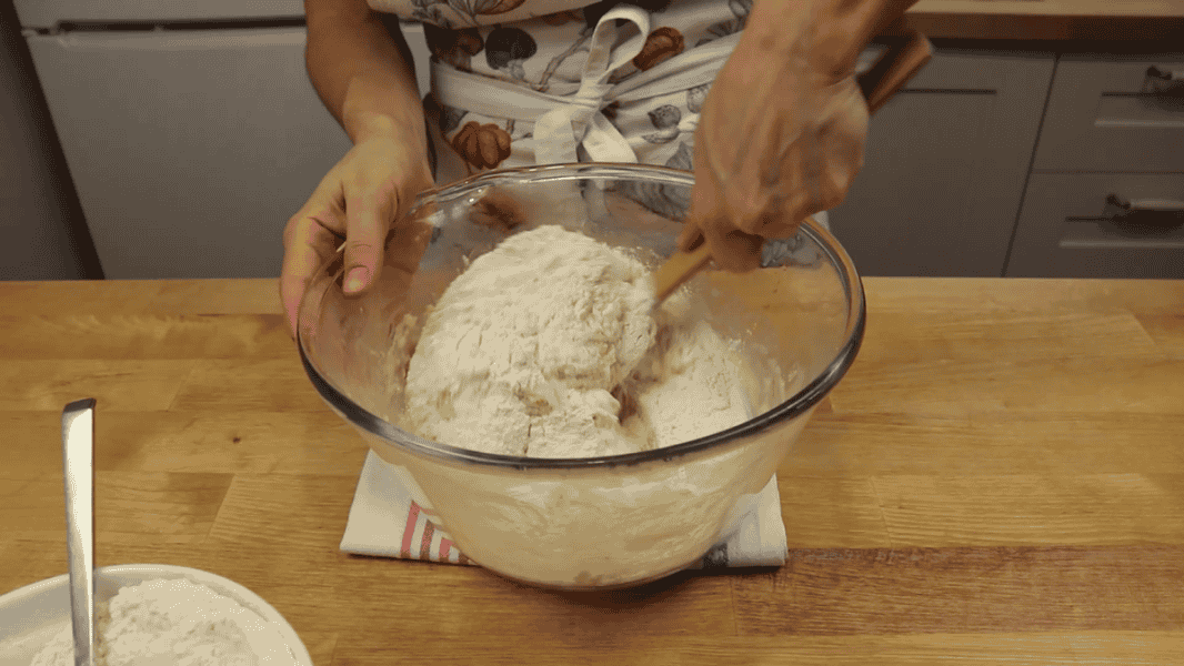 Підсипати борошно потрібно доти, поки тісто не перестане липнути до рук. Наприкінці борошно вже складно вмішуватиметься.