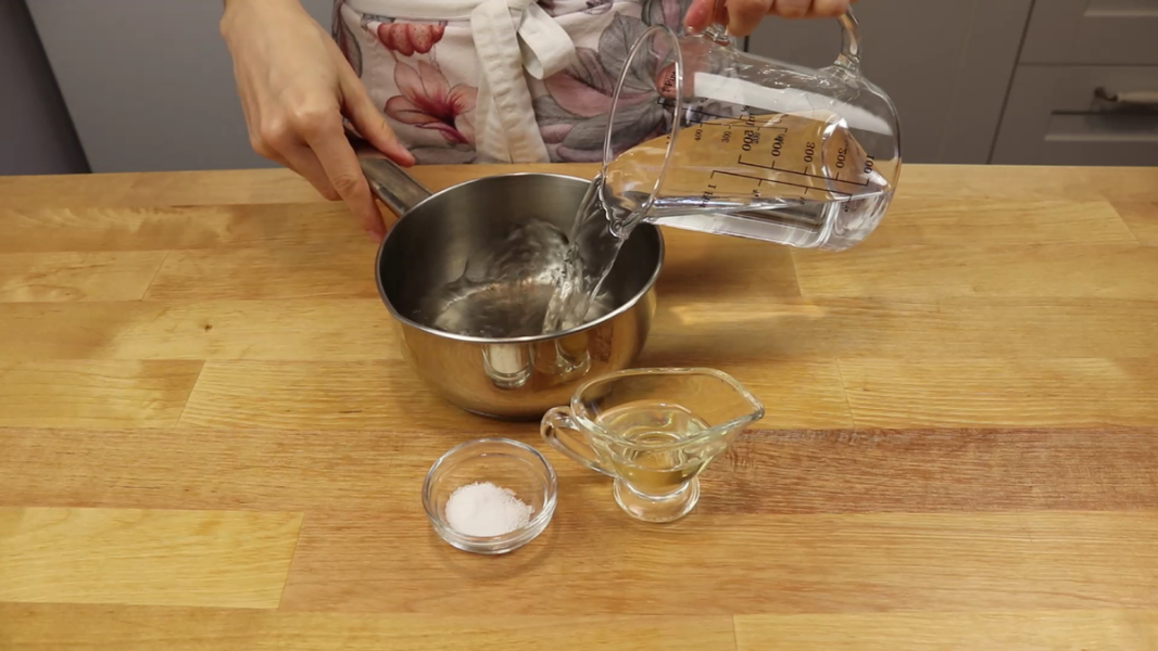 Насамперед потрібно приготувати тісто: Змішую воду, олію та сіль. Переношу на плиту.