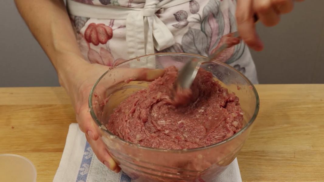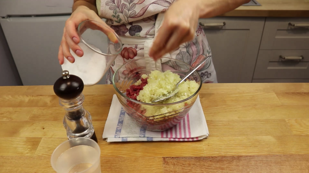 Для фаршу дуже дрібно рублю цибулю, ножем або в блендері. Додаю до м’яса цибулю, сіль та перець за смаком.