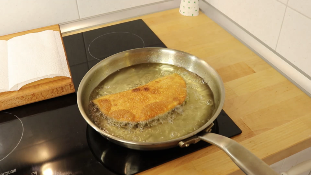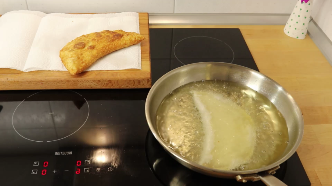 У сковороді або каструлі потрібно попередньо розігріти олію, її має бути на 2…3 см. Розігріваю хвилин 5. Жарю чебуреки з двох боків по кілька хвилин, акуратно перевертаючи. Дуже важливо, щоб олія була добре розігрітою, і олії має бути багато, щоб чебурек вільно плавав.